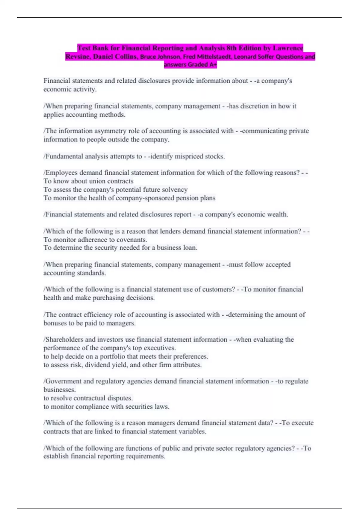 Test Bank for Financial Reporting and Analysis 8th Edition by Lawrence Revsine, Daniel Collins, Bruce Johnson, Fred Mittelstaedt, Leonard Soffer