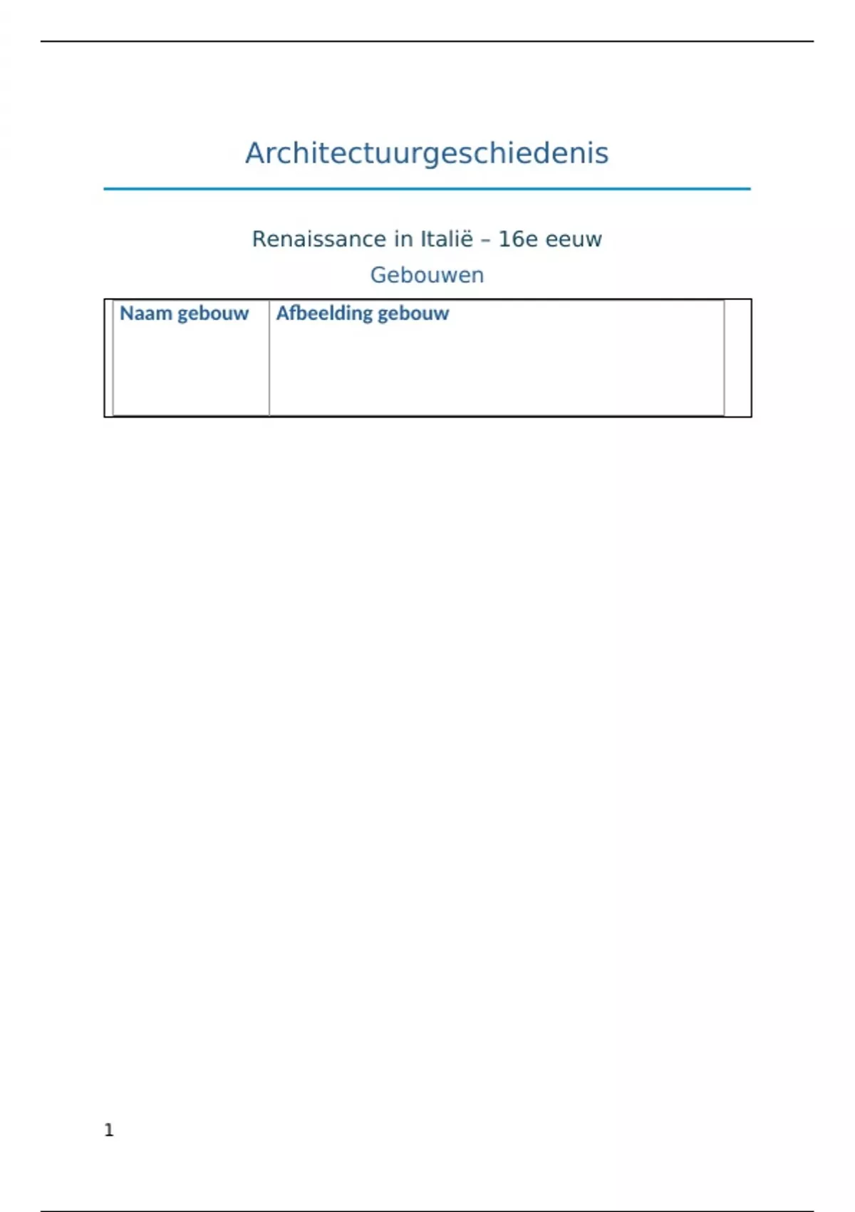 Dit is een overzicht van de te kennen gebouwen uit de Renaissance in Italië 16e eeuw met term - afbeelding/en - extra uitleg. Dit is van het academiejaar 2022/2023 toen het examen nog mondeling was, dus kijk zelf zeker of het nog up to date is. Gedoceerd door Professor Pieter Martens. Dit zijn de gebouwen in het document: - Bramante: Santa Maria presso San Satiro, Milaan, Santa Maria della Pace (kloostergang), Rome, Tempietto (bij San Pietro in Montorio), Rome, Cortile del Belvedere, Rome, Sint-Pieter (ontwerp), Rome - Sangallo: Sint-Pieter (ontwerp en houten maquette), Rome - Sangallo, Michelangelo: Palazzo Farnese, Rome - Santa Maria della Consolazione, Todi - Madonna di San Biagio, Montepulciano - Peruzzi: Villa Farnesina, Rome, Palazzo Massimo alle Colonne, Rome - Rafaël, Villa Madama, Rome - Romano: Palazzo Te, Mantua, Palazzo Ducale (binnenhof), Mantua - Michelangelo: façade San Lorenzo (ontwerp), Firenze, Sagrestia Nuova (Medici-kapel), Firenze, bibliotheek San Lorenzo (Biblioteca Laurenziana) en vestibule, Firenze, Campidoglio (Capitool), Rome, Sint-Pieter, Rome, Santa Maria degli Angeli, Rome, Porta Pia - Sanmichelli: Porta Nuova, Verona - Sansovino: Libreria (San Marco-bibliotheek), Venetië, Sansovino: Zecca (Munt), Venetië, Loggetta, Venetië - Palladio: I Quattro Libri, villa (algemeen), Villa Barbaro, Maser, Villa Capra “La Rotonda”, Vicenza, Palazzo della Ragione (“Basilica”), Vicenza, Palazzo Chiericati, Vicenza, Teatro Olimpico, Vicenza, San Francesco della Vigna (façade), Venetië, San Giorgio Maggiore, Venetië, Il Redentore, Venetië