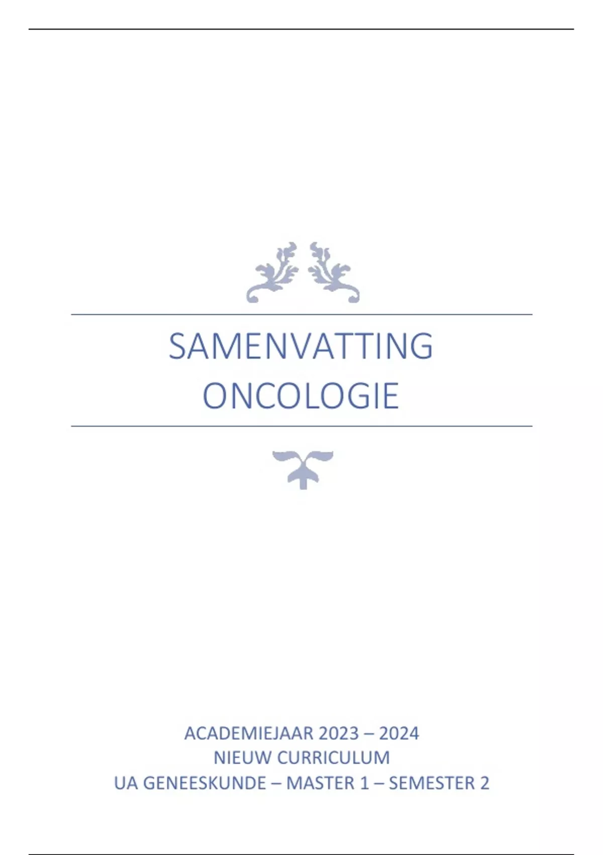 Nederlandstalige samenvatting van heel het vak Oncologie, gegeven in sem 1 in het NIEUWE CURRICULUM van Ma1 Geneeskunde op UA. Aangevuld met notities van alle lessen. Onderwerpen die in de les benoemd zijn als belangrijk staan aangeduid in fluo. Behaald resultaat: 18/20