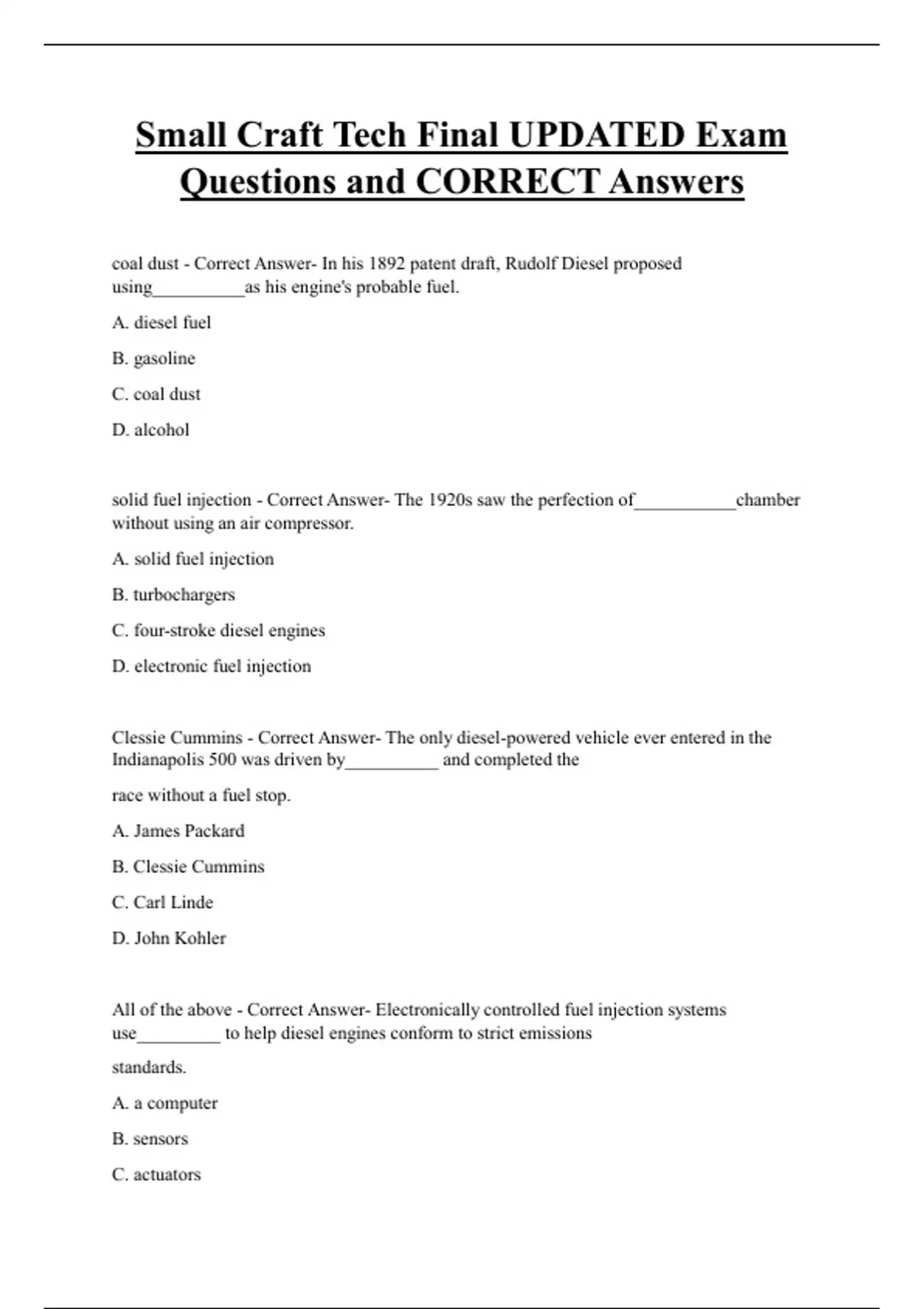 Small Craft Tech Final UPDATED Exam Questions and CORRECT Answers coal dust - Correct Answer- In his 1892 patent draft, Rudolf Diesel proposed using__________as his engine's probable fuel. A. diesel fuel B. gasoline C. coal dust D. alcohol solid fuel injection - Correct Answer- The 1920s saw the perfection of___________chamber without using an air compressor. A. solid fuel injection B. turbochargers C. four-stroke diesel engines D. electronic fuel injection