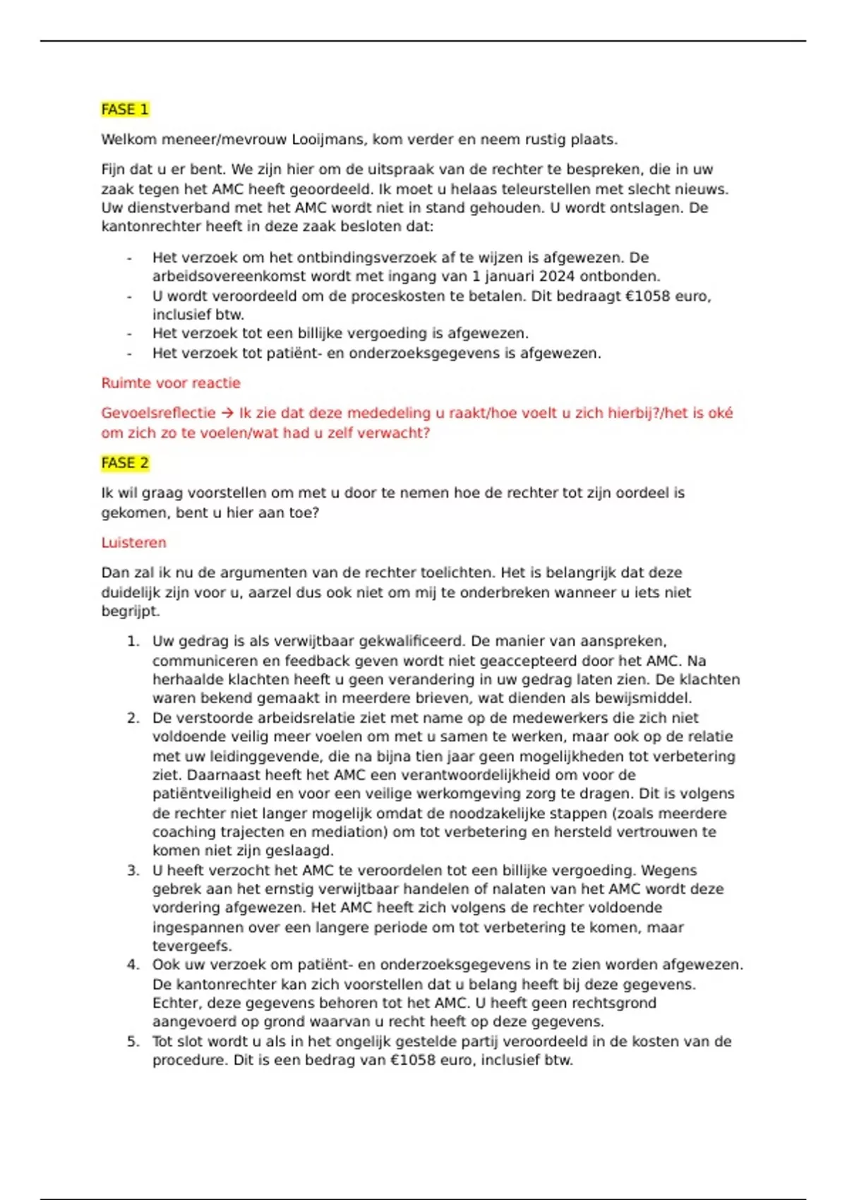 communiceren en feedback geven wordt niet geaccepteerd door het AMC. Na