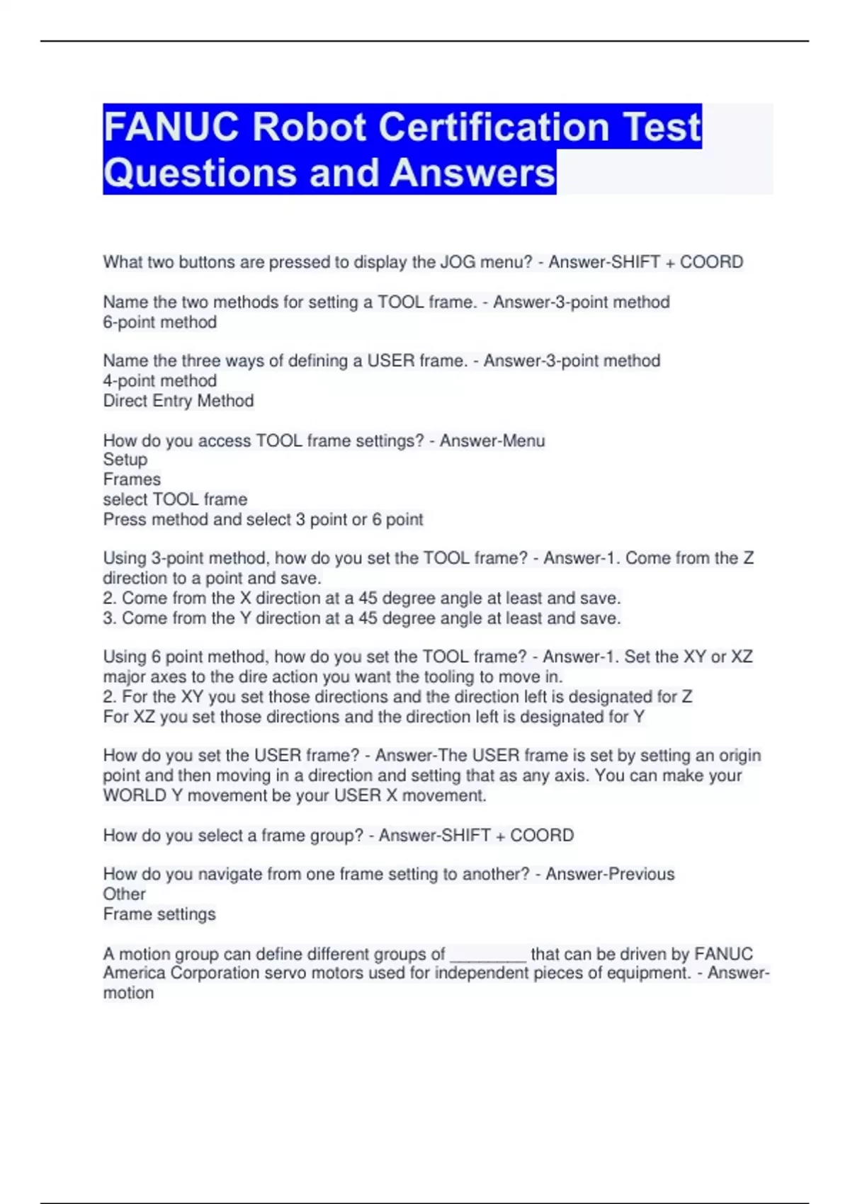 Using 6 point method, how do you set the TOOL frame? - Answer-1. Set the XY or XZ
