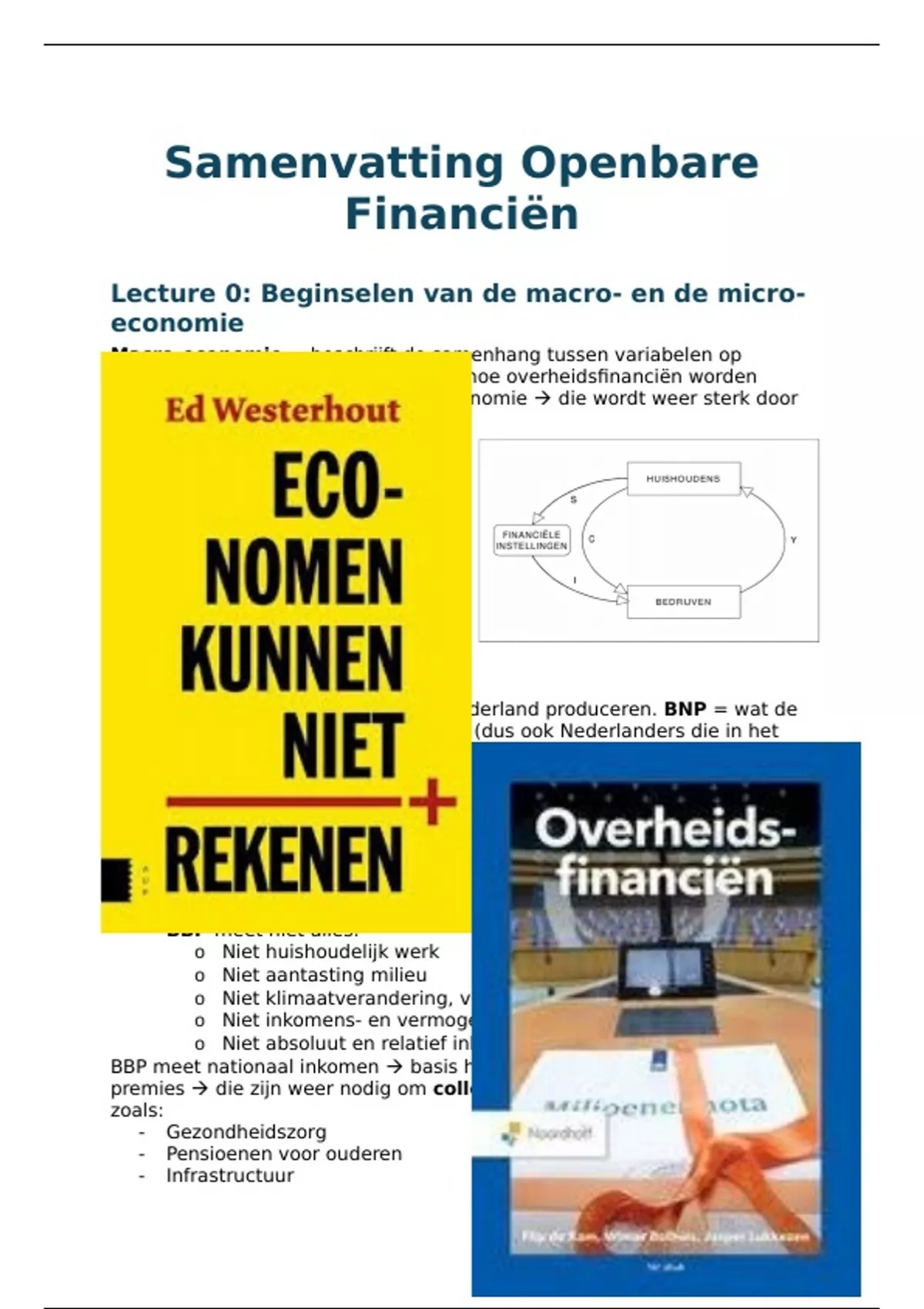 Volledige verkorte samenvatting van alle relevante tentamenstof voor het tentamen van het vak Openbare Financiën. Dus een samenvatting van het boek 'Overheidsfinanciën' van Flip de Kamp (9789001738785) en tevens de relevante hoofdstukken van het boek 'Economen Kunnen Niet Rekenen' van Ed Westerhout (9789089646149). Zitten tevens ook belangrijke aantekeningen uit het college in verwerkt. De samenvatting is verdeeld in de verschillende colleges en bevat ook 'college 0' die onderdeel was van de tentamenstof.