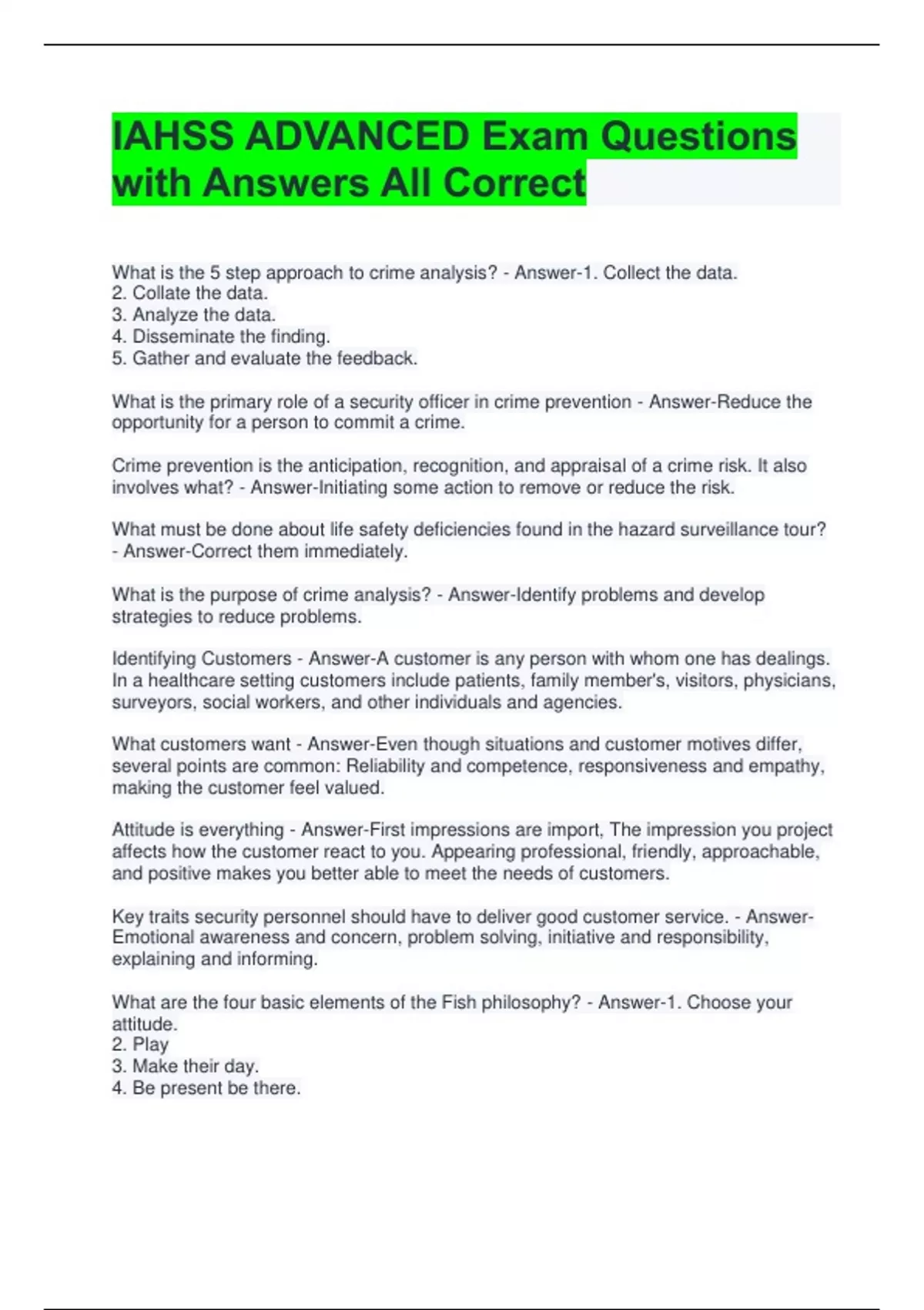 IAHSS ADVANCED Exam Questions with Answers All Correct What is the 5 step approach to crime analysis? - Answer-1. Collect the data. 2. Collate the data. 3. Analyze the data. 4. Disseminate the finding. 5. Gather and evaluate the feedback. What is the primary role of a security officer in crime prevention - Answer-Reduce the opportunity for a person to commit a crime. Crime prevention is the anticipation, recognition, and appraisal of a crime risk. It also involves what? - Answer-Initiating some action to remove or reduce the risk. What must be done about life safety deficiencies found in the hazard surveillance tour? - Answer-Correct them immediately. What is the purpose of crime analysis? - Answer-Identify problems and develop strategies to reduce problems. Identifying Customers - Answer-A customer is any person with whom one has dealings. In a healthcare setting customers include patients, family member's, visitors, physicians, surveyors, social workers, and other individuals and agencies. What customers want - Answer-Even though situations and customer motives differ, several points are common: Reliability and competence, responsiveness and empathy, making the customer feel valued. Attitude is everything - Answer-First impressions are import, The impression you project affects how the customer react to you. Appearing professional, friendly, approachable, and positive makes you better able to meet the needs of customers. Key traits security personnel should have to deliver good customer service. - Answer-Emotional awareness and concern, problem solving, initiative and responsibility, explaining and informing.
