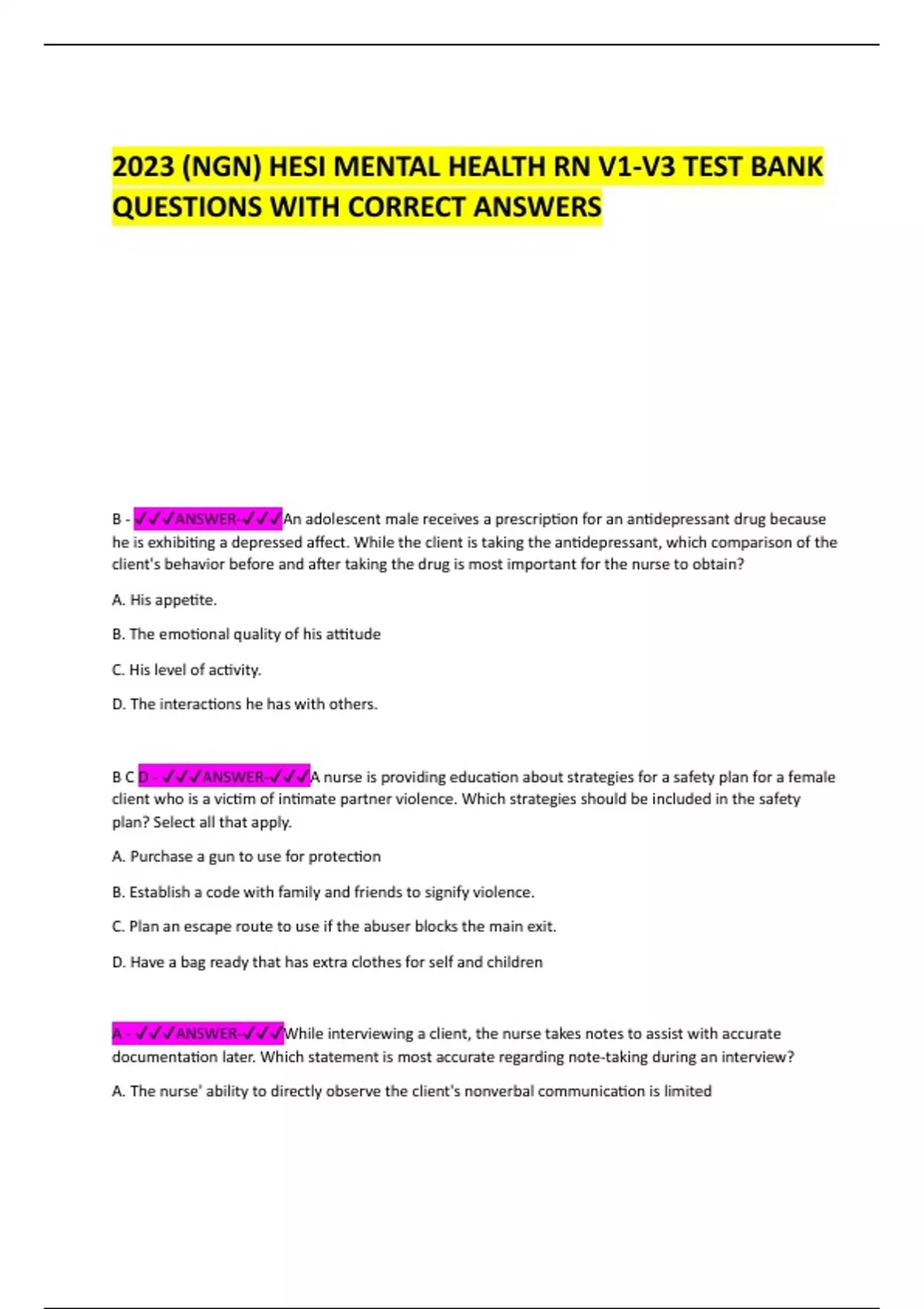 2023 (NGN) HESI MENTAL HEALTH RN V1-V3 TEST BANK