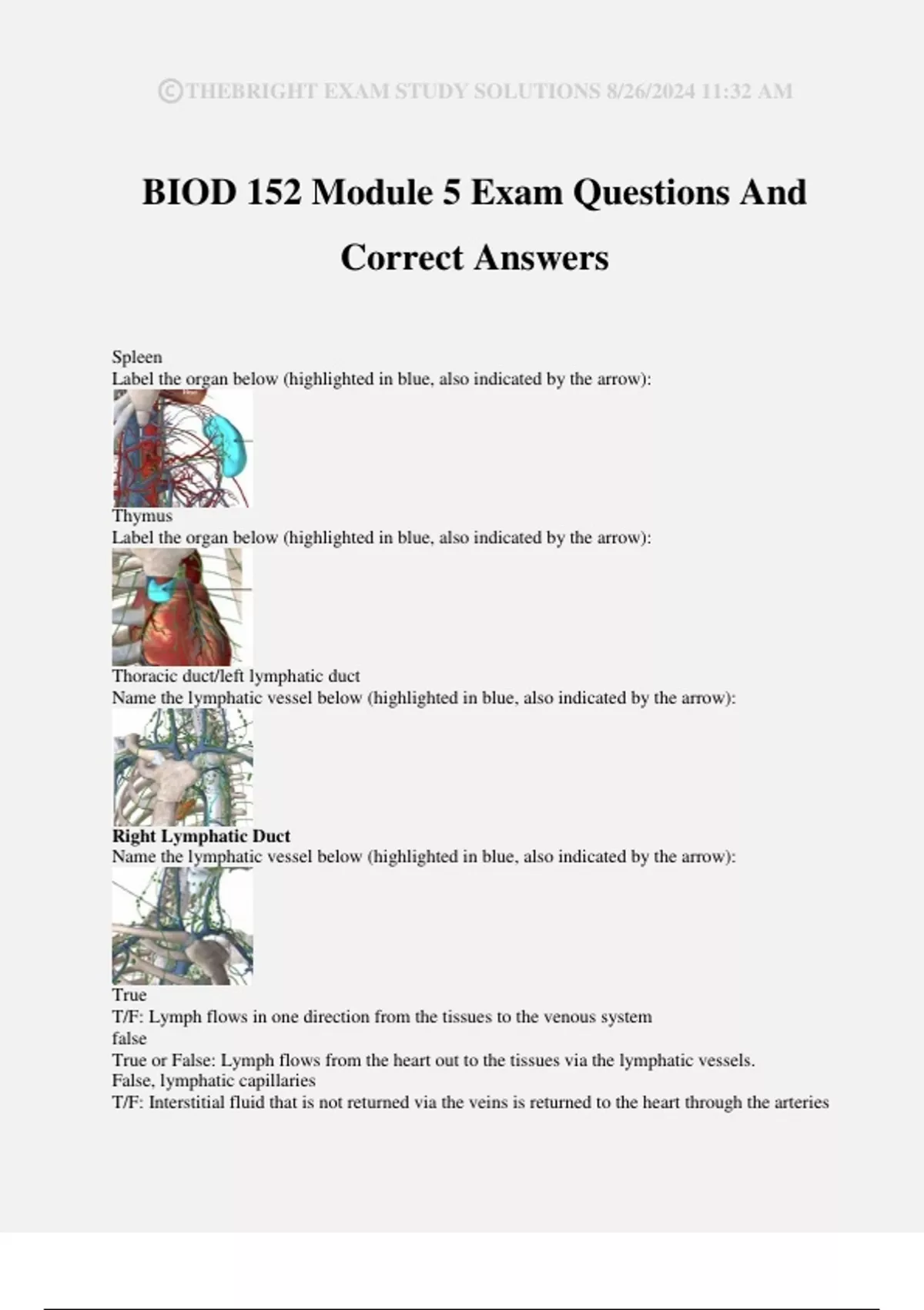 BIOD 152 Module 5 Exam Questions And Correct Answers Spleen Label the organ below (highlighted in blue, also indicated by the arrow): Thymus Label the organ below (highlighted in blue, also indicated by the arrow): Thoracic duct/left lymphatic duct Name the lymphatic vessel below (highlighted in blue, also indicated by the arrow): Right Lymphatic Duct Name the lymphatic vessel below (highlighted in blue, also indicated by the arrow): True T/F: Lymph flows in one direction from the tissues to the venous system false True or False: Lymph flows from the heart out to the tissues via the lymphatic vessels. False, lymphatic capillaries T/F: Interstitial fluid that is not returned via the veins is returned to the heart through the arteries ©THEBRIGHT EXAM STUDY SOLUTIONS 8/26/2024 11:32 AM true True or False: Fluid inside tissues that is not returned via the veins is returned to the heart through the lymph system. True T/F: Lymph fluid moves in the following order: interstitial fluid > lymph capillaries > lymph vessels > lymphatic duct > veins false Correct Order: lymph capillaries-vessels-lymph ducts-subclavian vein True or False: Lymph fluid moves in the following order: Lymphatic Duct→ lymph vessels → Lymph capillaries → Veins Thoracic duct A patient has lymphedema in his right leg. What lymph vessel would most likely be obstructed? A. Thoracic duct B. Right lymphatic duct C. Inferior vena cava D. femoral vein There are more efferent vessels than afferent vessels Which of the following is FALSE concerning lymph nodes? A. The groin contains a large grouping of lymph nodes B. The axilla contains a large grouping of lymph nodes C. A lymph node is an encapsulated fibrous connective tissue with incoming and outgoing vessels D. There are more efferent vessels than afferent vessels E. A&B are false It acts as a filtering center to remove debris Which is true concerning the spleen? A. It is found in the right side of the abdomen B. It acts as a filtering center to remove debris C. It has many efferent and afferent lymph vessels D. It is divided into regions called sinuses which filter lymph E. C&D are true Lymph nodes act as a filtering center to remove debris Which of the following statements is TRUE concerning lymph nodes? A. Lymph nodes tend to be grouped together in palms of the hand and the bottoms of the feet. B. Lymph nodes act as a filtering center to remove debris C. There are more efferent vessels than afferent vessels D. Fluid flows into the efferent vessels and out of the afferent vessels E. C & D are true It has many efferent and afferent lymph vessels. (it has one incoming artery and one outgoing vein) Which of the following statements is FALSE concerning the spleen? A. It is found in the left side of the abdomen. B. It acts as to remove old platelets in the blood. C. It has many efferent and afferent lymph vess