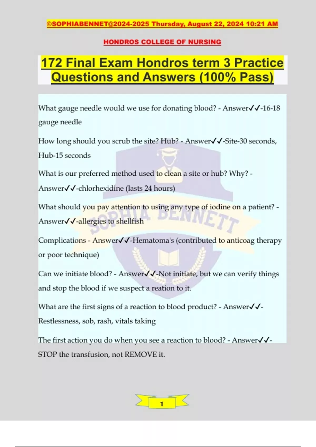 172 Final Exam Hondros term 3 Practice Questions and Answers (100% Pass) What gauge needle would we use for donating blood? - Answer️️ -16-18 gauge needle How long should you scrub the site? Hub? - Answer️️ -Site-30 seconds, Hub-15 seconds What is our preferred method used to clean a site or hub? Why? - Answer️️ -chlorhexidine (lasts 24 hours) What should you pay attention to using any type of iodine on a patient? - Answer️️ -allergies to shellfish Complications - Answer️️ -Hematoma's (contributed to anticoag therapy or poor technique) Can we initiate blood? - Answer️️ -Not initiate, but we can verify things and stop the blood if we suspect a reation to it. What are the first signs of a reaction to blood product? - Answer️️ - Restlessness, sob, rash, vitals taking The first action you do when you see a reaction to blood? - Answer️️ - STOP the transfusion, not REMOVE it. ©SOPHIABENNET@ Thursday, August 22, 2024 10:21 AM HONDROS COLLEGE OF NURSING 2 Blood products - Answer️️ -Albumin is a blood expander and can cause pulmonary edema, increase cardiac output (increase BP), you are at NO risk for transmitting hepatitis from albumin, acts as a transport for the protein Patient who needs to receive packed red blood cells - Answer️️ -admitted with bright red emesis, heart rate of 120, high pulse low bp, Hgb of 7.8 (usually an Hgb under 9 is a sign of patient being unstable) Biggest risk of packed RBC's is fluid volume overload, which patient would be at risk? - Answer️️ -68 year old with hx of CHF Transfusion associated transgraft verst post disease- Who is at risk? - Answer️️ -Someone who is immunocompromised- patient with AIDS Patient who is exhibiting S&S of acute hemolytic transfusion reaction, LPN at bedside would immediately do what action? - Answer️️ -Stop the blood transfusion Patient has 0+ blood and gets B+ blood, patient has reaction, what is the reaction and expected treatment? - Answer️️ -Stop the transfusion LPN in the room and has obtained vitals, notices that RN is priming with LR, what action would LPN take? - Answer️️ -Tell the RN that you only prime blood with NS solution. Patient has IV with albumin, what will LPN care of this patient include? - Answer️️ -Monitor for crackles and tachycardia ©SOPHIABENNET@ Thursday, August 22, 2024 10:21 AM HONDROS COLLEGE OF NURSING 3 Observing new nurse providing phlebotomy, what would require intervention? - Answer️️ -They take the blood back to nurse's station to label them (should be done prior) During blood collection, nurse notices hematoma. What action would you take? - Answer️️ -DC collection and apply pressure to site until bleeding stops What symptoms would you expect to observe in a patient that has a citric toxicity (causes hypocalcemia) from a rapid blood transfusion? - Answer️️ -Positive trousseau sign, Positive Chvostek's sign TACO - Answer️️ -causes hypertension, severe headache, JVD, Dyspnea, pink frothy sputum (sputum is on another question, not this one) Patient getting packed RBC, what are signs that they are having an acute reaction? - Answer️️ -Chest pain, tachycardia, hypotension (back pain as well which is not on test) When inserting IV on elderly adult with fragile veins, which interventions would you like to implement? - Answer️️ -Placing tourniquet over the patient's gown, using BP cuff as tourniquet, lowering the angle of approach into the vein When inserting IV, it would be important to maintain the patient's safety by? - Answer️️ -wash hands prior to inserting IV, applying tape or ©SOPHIABENNET@ Thursday, August 22, 2024 10:21 AM HONDROS COLLEGE OF NURSING 4 stabilization device to prevent from pistoning, release tourniquet BEFORE flushing Side note - Answer️️ -Nurse's responsibility for applying bio-patch to CBC site per facility policy with dressing change, I will stop the infusion if adverse effect occur. Teaching patient about PCA pumps, what is important? - Answer️️ -Want to reinforce medication side effects, ONLY the patient pushes the button, how to push the button, in addition to teaching the patient- teach the family NOT to push the button. As LPN, which physician order can you as the LPN carry out? - Answer️️ -Sub Q injections, Perco tablets orally Q2H, heparin flush IV law OBN, what can an LPN do? - Answer️️ -Give IV to patient 18 and over, stop PCA pump if patient has inadequate respirations Elderly patient who has pulmonary edema, which orders can the LPN carry out for this patient? - Answer️️ -Apply O2 per nasal cannula and monitor O2, replacing water with ice chips, peripheral IV saline lock. Monitoring patient with central line for sepsis, these are the S&S that would indicate possible sepsis.. - Answer️️ -oral temp of 103, elevated WBC (4-10k is normal)of 18k, patient is shaking vigorously and complaining of being cold ©SOPHIABENNET@ Thursday, August 22, 2024 10:21 AM HONDROS COLLEGE OF NURSING 5 You have a 42 year old patient vomiting for 3 days and is not pregnant, which orders/interventions could and should you, the LPN, implement? - Answer️️ -Start NS at 160ml/hr, insert peripheral IV in the forearm, be alert and check for tinting. Universal donor - Answer️️ -O(-) Universal recipient - Answer️️ -AB Central line dressing change - Answer️️ -A-Septic (sterile stays sterile, clean stays clean) (Sterile) Blood - Answer️️ -Same technique but once you clean