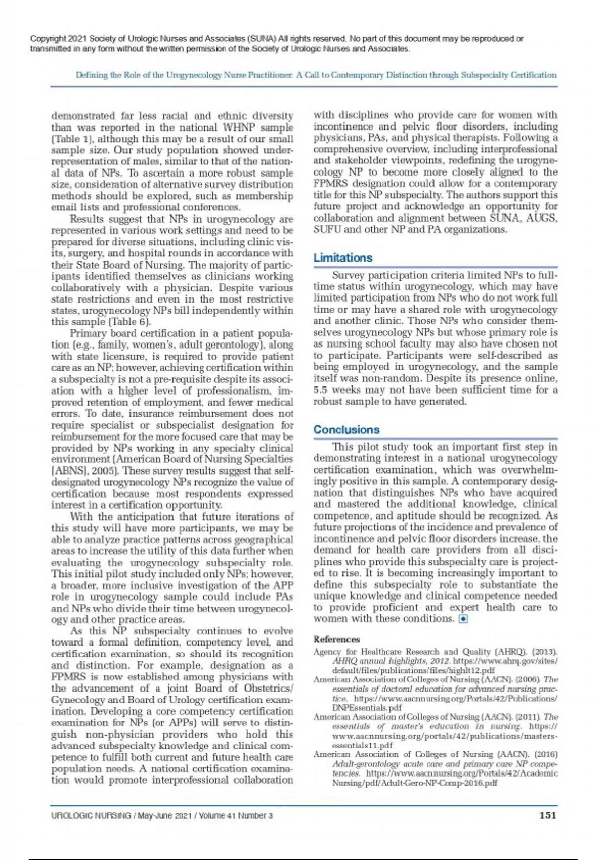 Defining the Role of the Urogynecology Nurse Practitioner: A Call to Contemporary Distinction through Subspecialty Certification Jennifer L. Cera, DNP, APRN-NP, WHNP-BC; Melanie Schlittenhardt, DNP, APRN, FNP-BC, CUNP; Amy Hull, DNP, WHNP-BC; and Susanne A. Quallich, PhD, ANP-BC, NPC, CUNP, FAUNA, FAANP Research 1.4 contact hours © 2021 Society of Urologic Nurses and Associates Cera, J.L., Schlittenhardt, M., Hull, A., & Quallich, S.A. (2021). Defining the role of the urogynecology nurse practitioner: A call to contemporary distinction through subspecialty certification. Urologic Nursing, 41(3), 141-152. https:// This is the first survey conducted to examine the role of the urogynecology nurse practitioner (NP) and highlights the need for the development of a current, distinct description of the sub-specialty role. Descriptive statis tics were used to report the characteristics of the sam ple group (N = 55). This article reports on the urogyne cology subspecialty NP role, creates a basis that can be used when negotiating a new position or promotion, and provides insight into whether NPs who practice in this subspecialty are interested in a national certification examination to distinguish their expertise. Proposing a new designation that aligns with current female pelvic medicine and reconstructive surgery (FPMRS) physi cians to replace urogynecology NP is discussed as a possible natural progression to define the specific knowledge, clinical competence, and aptitude needed to practice in this field. Key Words Clinical competence, advanced practice provider, workforce, specialty practice, urology, women’s health, urodynamics, ambulatory care, urogynecology. Instructions for NCPD Contact Hours UNJ 2104 Nursing continuing professional development (NCPD) contact hours can be earned for completing the learning activity associated with this article. Instructions are available at Deadline for submission: June 30, 2023 Urogynecology is emerging as a subspecialty role for nurse practitioners (NPs) whose focus is on pre vention and treatment of female urinary and fecal incontinence (also known as dual incontinence) and pelvic floor disorders (PFDs). An increased demand for NPs with knowledge and expertise in this sub specialty is projected to grow considering the preva lence of these conditions, the aging population, and the current shortage of physicians who provide care for this population. According to the U.S. Census Bureau, by 2030, there will be a 35% increased demand in care for women with incontinence and PFD, which is only expected to rise (Kirby et al., 2013). Physician specialists, such as urologists, gynecologists, and female pelvic medicine and reconstructive surgeons (FPMRS), provide most of the care for these conditions. However, there is a Jennifer L. Cera, DNP, APRN-NP, WHNP-BC, is an Assistant Professor and Co-Coordinator, Women’s Health Specialty Program, University of Nebraska Medical Center College of Nursing – Omaha Division, College of Nursing Science; and a Women’s Health Nurse Practitioner, Female Pelvic Medicine & Urogynecology, Olson Center for Women’s Health, Nebraska Medicine, Omaha, NE; and is a mem ber of the Urologic Nursing Editorial Board. Melanie Schlittenhardt, DNP, APRN, FNP-BC, CUNP, is a Family Nurse Practitioner and Co-Owner of an independent continence clin ic, Pelican Health, Bismarck, ND. Amy Hull, DNP, WHNP-BC, is an Assistant Professor of Clinical Obstetrics and Gynecology, Vanderbilt University Medical Center, Nashville, TN. Susanne A. Quallich, PhD, ANP-BC, NPC, CUNP, FAUNA, FAANP, is an Assistant Professor of Urology and Andrology Nurse Practitioner, Division of Andrology, General and Community Health, Department of Urology, University of Michigan Health System, Ann Arbor, MI; Fellows Taskforce Chair, Fellows of the Academy of Urologic Nurses and Associates (FAUNA); and Editor, Urologic Nursing. Editor’s Note: Findings of the study do not necessarily reflect the opinions of SUNA. The views expressed herein are those of the authors, and no official endorsement by SUNA is intended or should be inferred. This article was vetted through the journal’s standard, blinded peer review process. 141 UROLOGIC NURSING / May-June 2021 / Volume 41 Number 3 Copyright 2021 Society of Urologic Nurses and Associates (SUNA) All rights reserved. No part of this document may be reproduced or transmitted in any form without the written permission of the Society of Urologic Nurses and Associates. Research Research Summary Introduction There is little discussion of nurse practitioner (NP) sub specialty roles in the literature and very minimal specific to urogynecology. This article presents data relative to the urogynecology NP position, including interest in a national certification to define and clarify its unique role. Methods A convenience sample was obtained via five online platforms, along with encouraging respondents to forward the survey link to colleagues (snowball sampling), to attempt to access as wide a sample as possible. Sample Results Only NPs working in urogynecology environments were eligible, regardless of years of experience. A total of 55 NPs completed the survey, representing a range of states and practice experience, as well as experi enced and recent graduate NPs. Sample demographics were similar to national and women’s health NP results, although our sample was slightly younger. The majority of deficit of urologists (American Urological Associa tion [AUA], 2018) and gynecologists (Vetter et al., 2019) in the United States. Even though the projec tion of FPMRS physicians is anticipated to increase, the physician/patient ratio will remain steady at its current level (Brueseke et al., 2016). A hallmark of the NP profession is health pro motion and disease prevention, along with serving as primary care providers in the assessment, diagno sis, and management of health care conditions. Recent research in urogynecology emphasizes the need fo