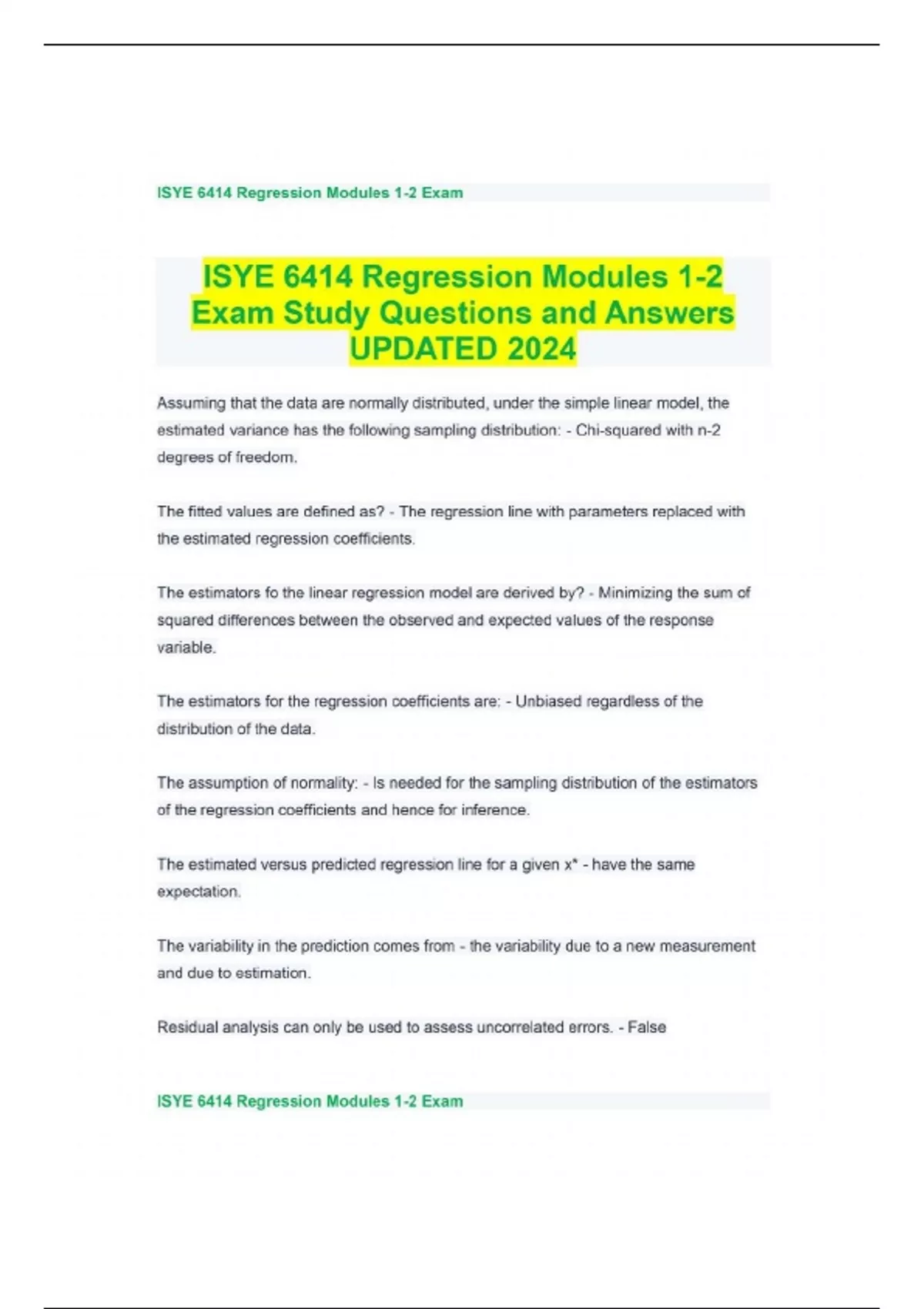 ISYE 6414 Regression Modules 1-2 Exam Study Questions and Answers UPDATED 2024