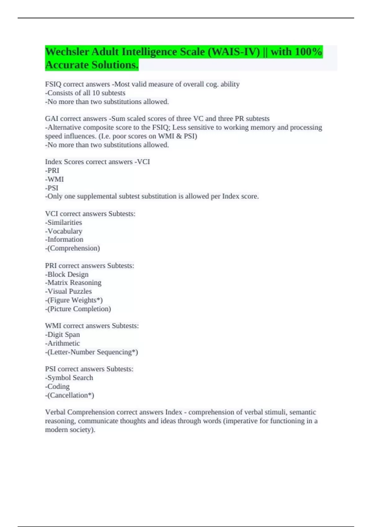 Wechsler Adult Intelligence Scale (WAIS-IV) || with 100% Accurate Solutions.
