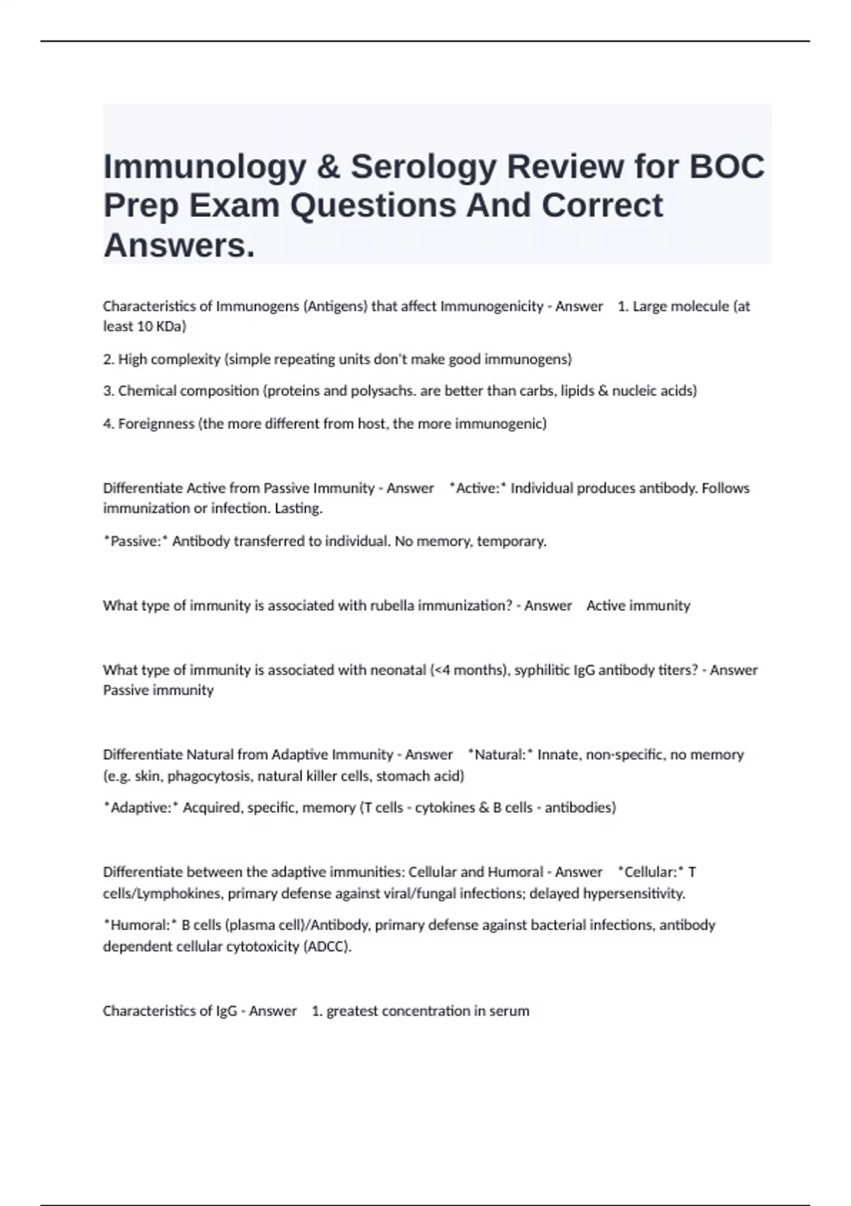 Differentiate Active from Passive Immunity - Answer *Active:* Individual produces antibody. Follows