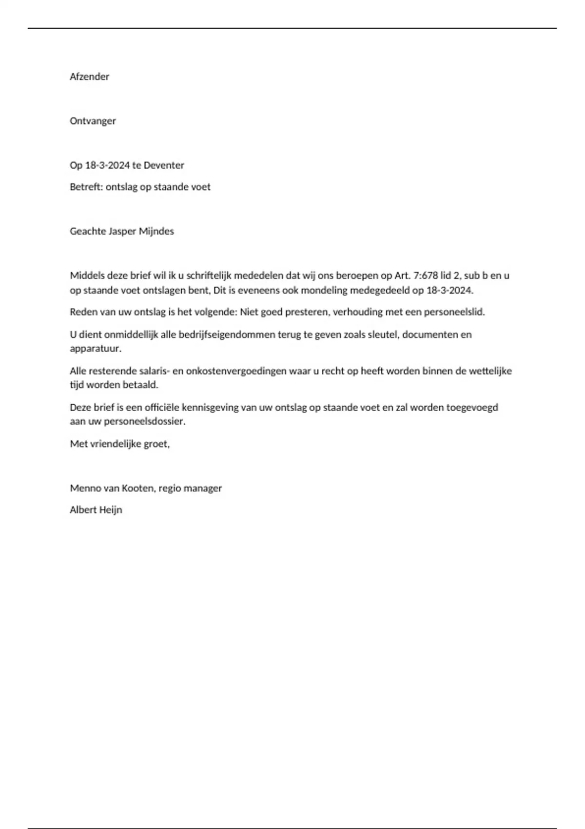 Deze brief is een officiële kennisgeving van uw ontslag op staande voet en zal worden toegevoegd