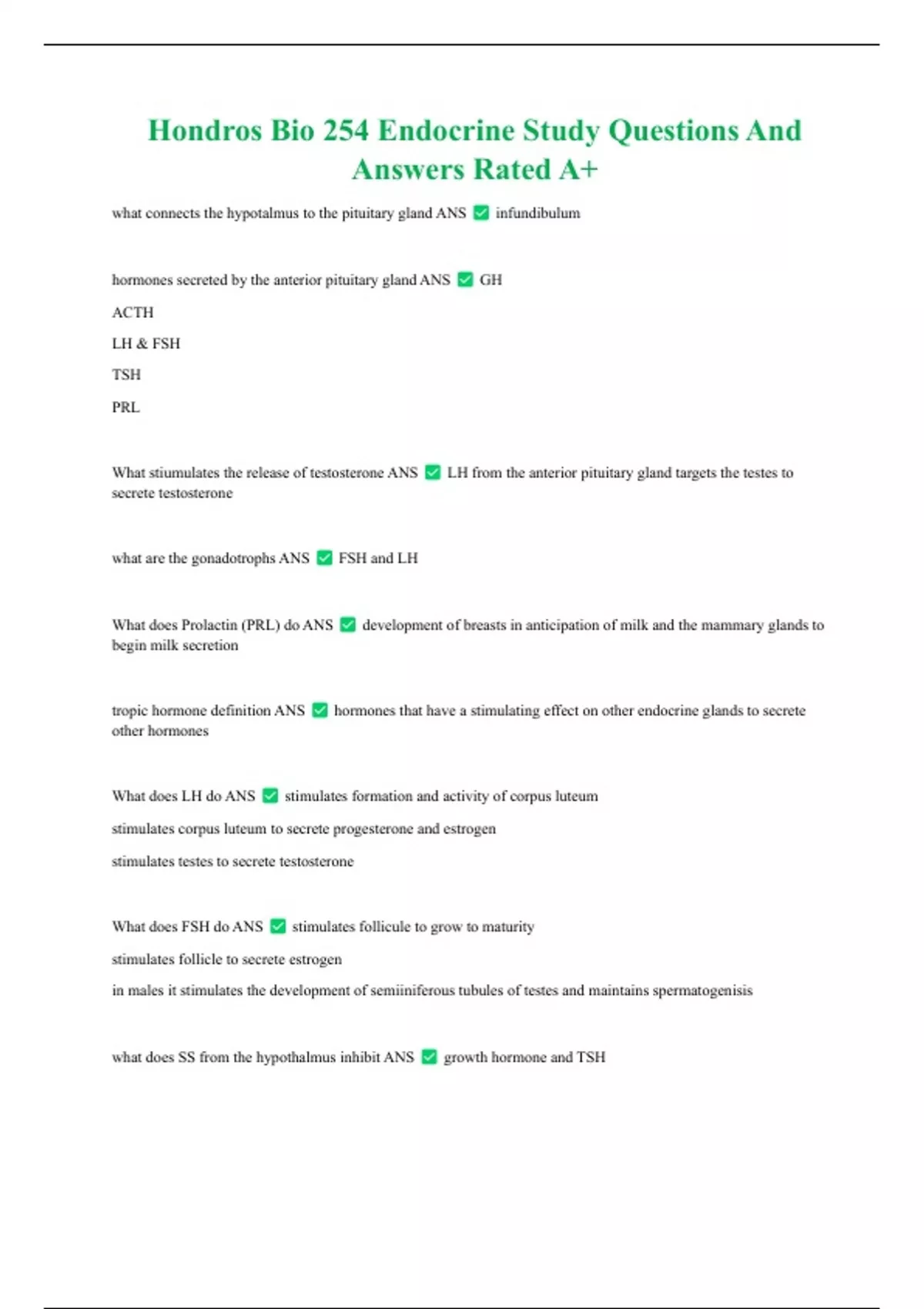 Hondros Bio 254 Endocrine Study Questions And Answers Rated A+ what connects the hypotalmus to the pituitary gland ANS infundibulum hormones secreted by the anterior pituitary gland ANS GH ACTH LH & FSH TSH PRL What stiumulates the release of testosterone ANS LH from the anterior pituitary gland targets the testes to secrete testosterone what are the gonadotrophs ANS FSH and LH What does Prolactin (PRL) do ANS development of breasts in anticipation of milk and the mammary glands to begin milk secretion