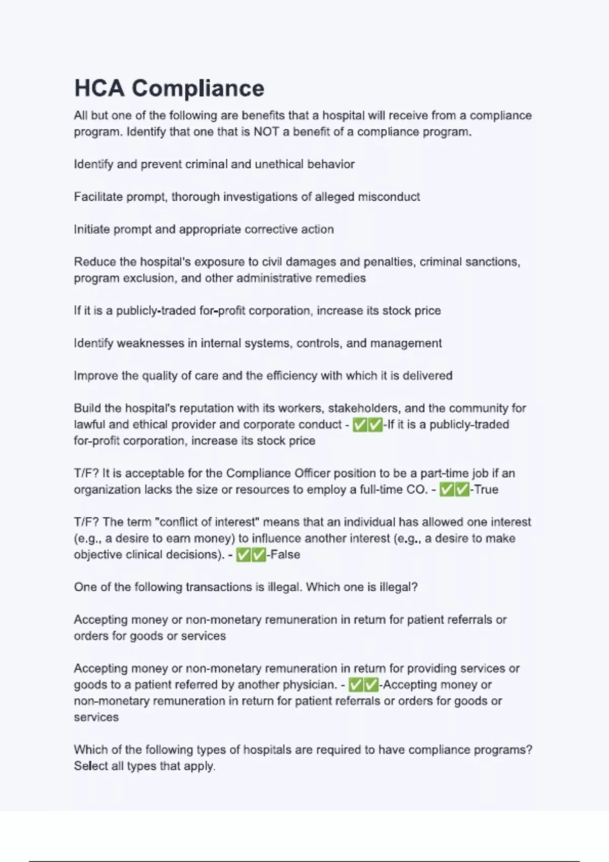 HCA Compliance with verified correct answers - complete solution 2024