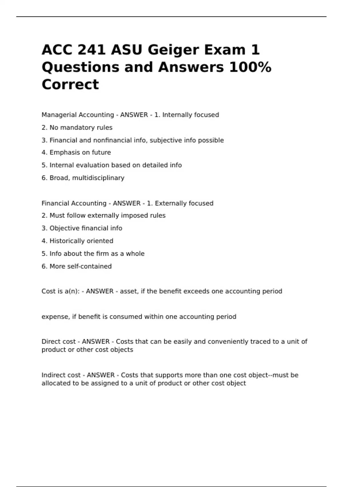 ACC 241 ASU Geiger Exam 1 Questions and Answers 100% CorrectACC 241 ASU Geiger Exam 1 Questions and Answers 100% CorrectACC 241 ASU Geiger Exam 1 Questions and Answers 100% CorrectACC 241 ASU Geiger Exam 1 Questions and Answers 100% Correct Managerial Accounting - ANSWER - 1. Internally focused 2. No mandatory rules 3. Financial and nonfinancial info, subjective info possible 4. Emphasis on future 5. Internal evaluation based on detailed info 6. Broad, multidisciplinary Financial Accounting - ANSWER - 1. Externally focused 2. Must follow externally imposed rules