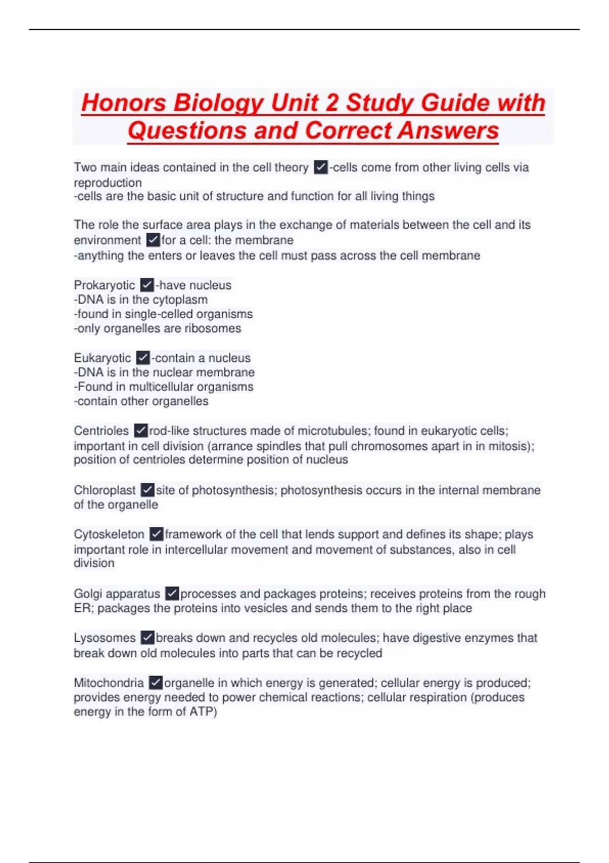 Honors Biology Unit 2 Study Guide with Questions and Correct Answers