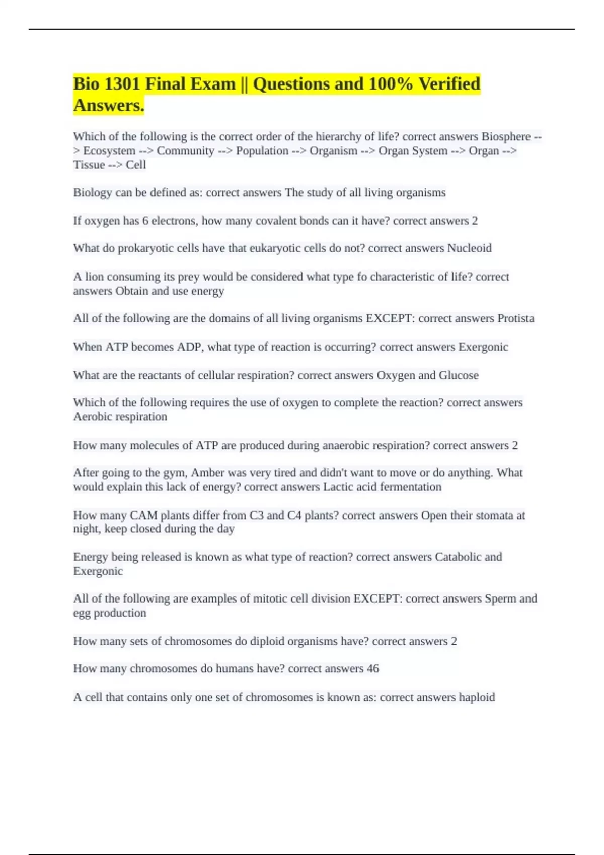 Bio 1301 Final Exam || Questions and 100% Verified Answers.