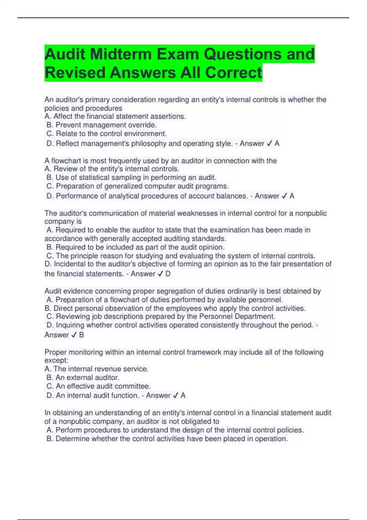 Audit Midterm Exam Questions and Revised Answers All Correct An auditor's primary consideration regarding an entity's internal controls is whether the policies and procedures A. Affect the financial statement assertions. B. Prevent management override. C. Relate to the control environment. D. Reflect management's philosophy and operating style. - Answer A A flowchart is most frequently used by an auditor in connection with the A. Review of the entity's internal controls. B. Use of statistical sampling in performing an audit. C. Preparation of generalized computer audit programs. D. Performance of analytical procedures of account balances. - Answer A The auditor's communication of material weaknesses in internal control for a nonpublic company is A. Required to enable the auditor to state that the examination has been made in accordance with generally accepted auditing standards. B. Required to be included as part of the audit opinion. C. The principle reason for studying and evaluating the system of internal controls. D. Incidental to the auditor's objective of forming an opinion as to the fair presentation of the financial statements. - Answer D Audit evidence concerning proper segregation of duties ordinarily is best obtained by A. Preparation of a flowchart of duties performed by available personnel. B. Direct personal observation of the employees who apply the control activities. C. Reviewing job descriptions prepared by the Personnel Department. D. Inquiring whether control activities operated consistently throughout the period. - Answer B Proper monitoring within an internal control framework may include all of the following except: A. The internal revenue service. B. An external auditor. C. An effective audit committee. D. An internal audit function. - Answer A