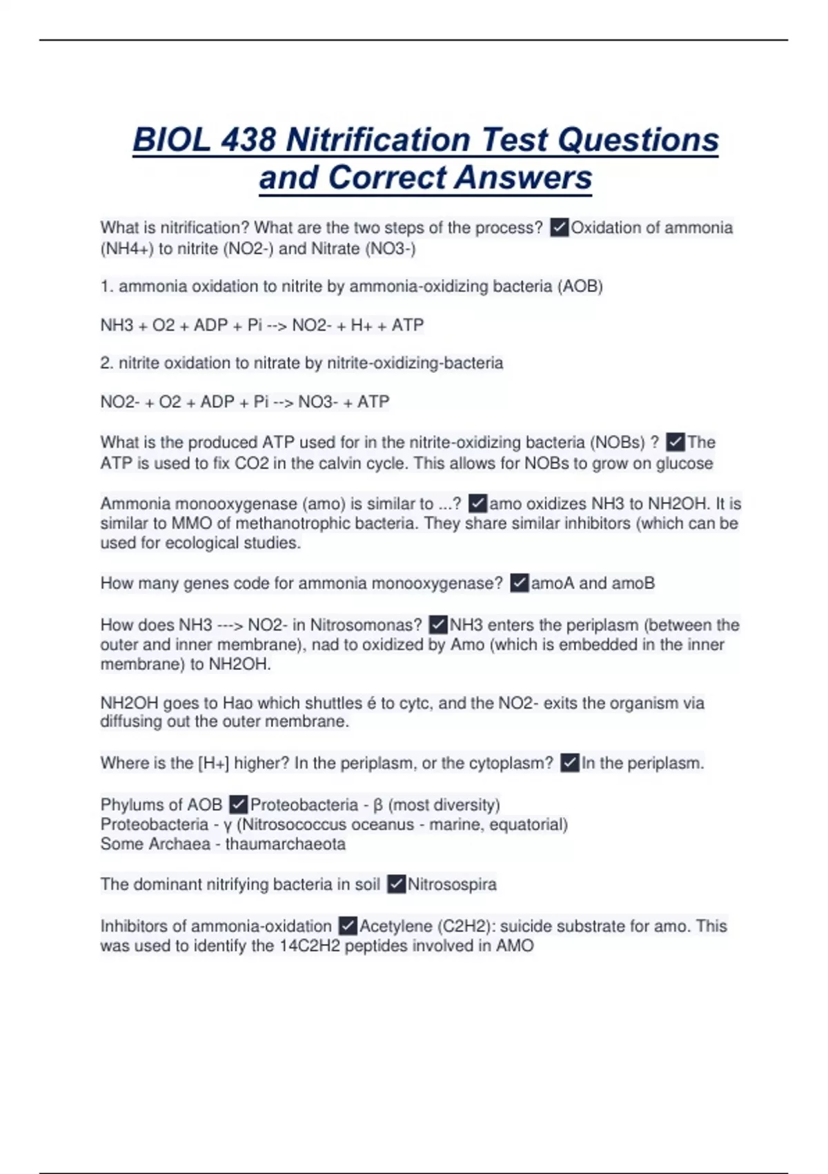 BIOL 438 Nitrification Test Questions and Correct Answers