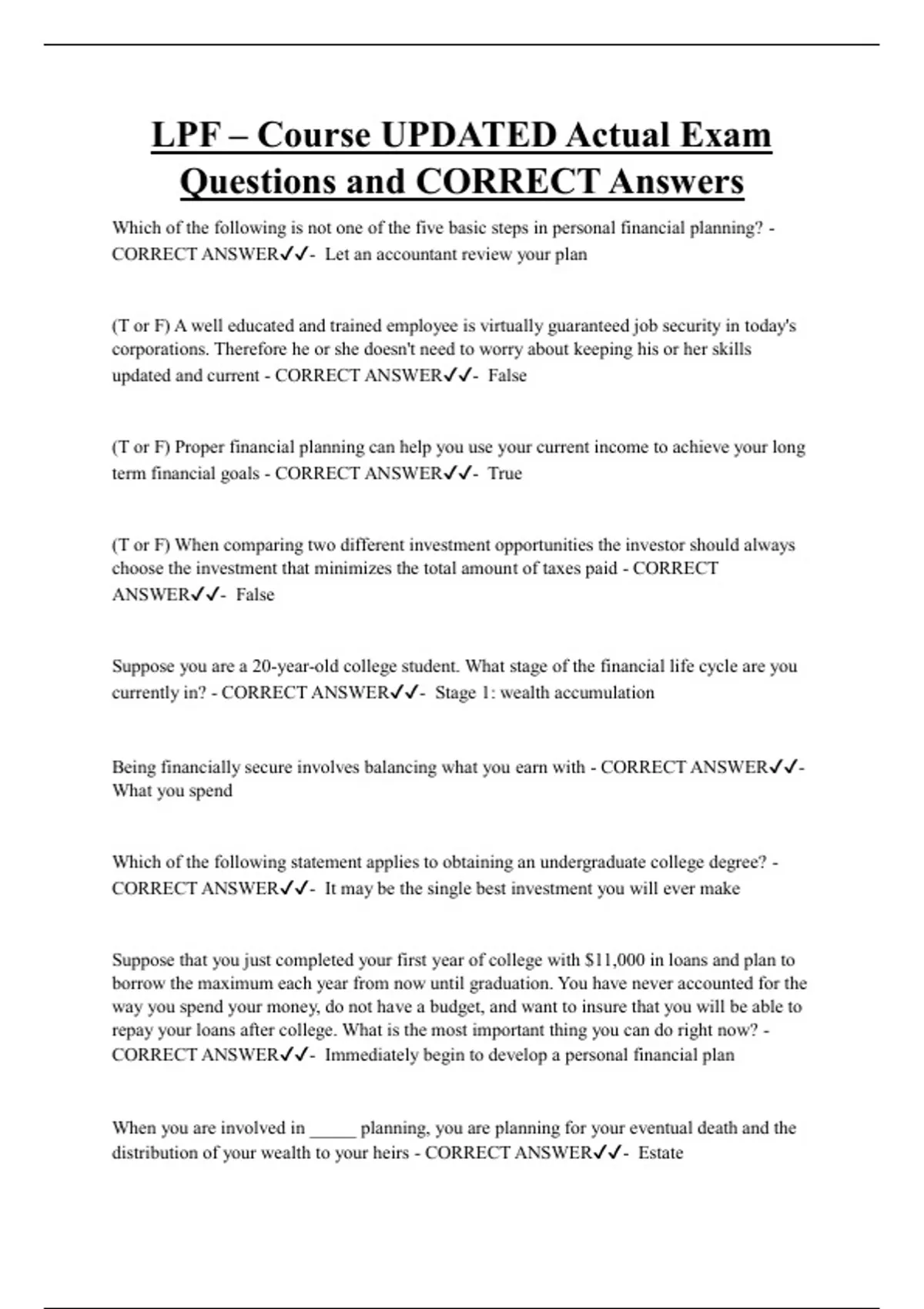 LPF – Course UPDATED Actual Exam Questions and CORRECT Answers Which of the following is not one of the five basic steps in personal financial planning? - CORRECT ANSWER- Let an accountant review your plan (T or F) A well educated and trained employee is virtually guaranteed job security in today's corporations. Therefore he or she doesn't need to worry about keeping his or her skills updated and current - CORRECT ANSWER- False