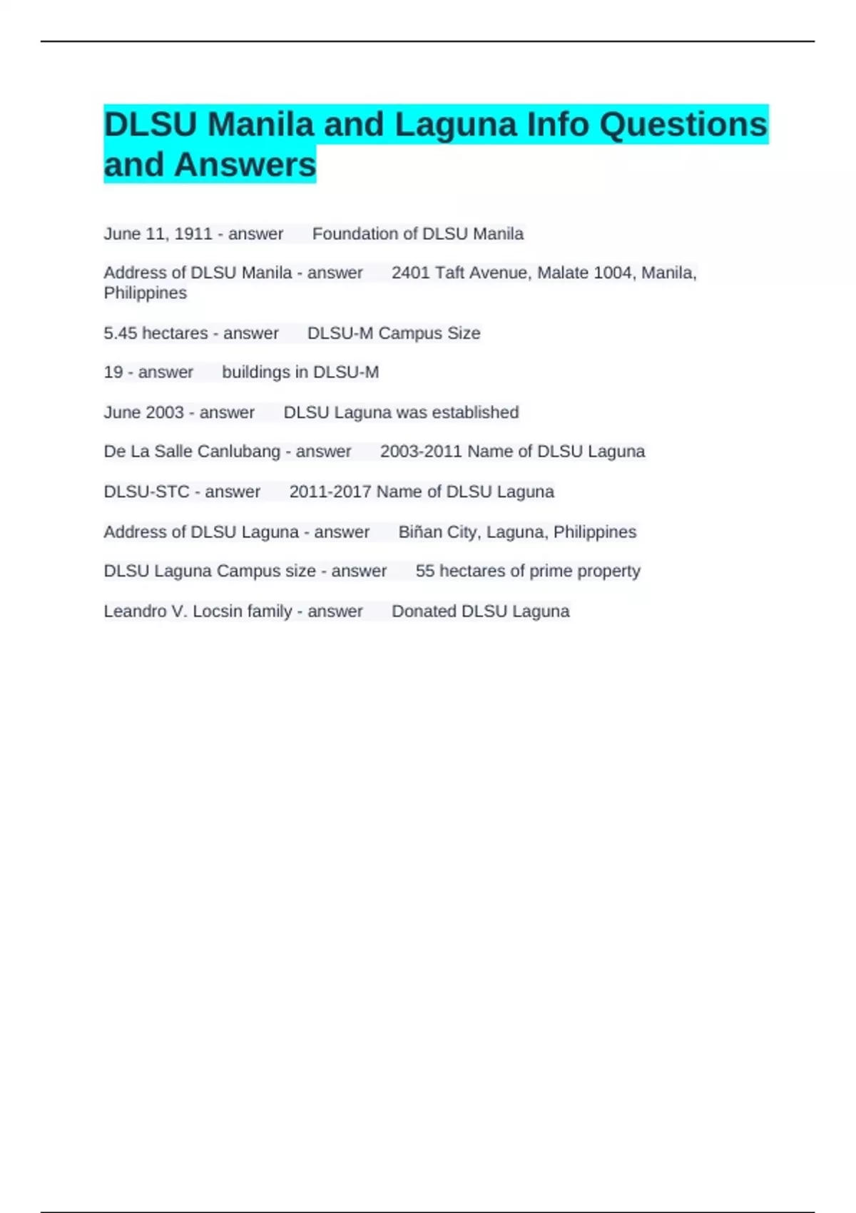 Address of DLSU Laguna - answer Biñan City, Laguna, Philippines