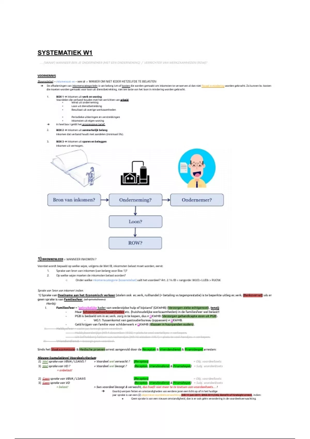 Dit bestand biedt een beknopte samenvatting en een duidelijke overzicht van de systematiek alle rechtsregels die je in je Wetboek en Jurisprudentie tegen zou komen voor week 1 t/m 5. Ik miste voor dit vak heel erg een bestand die de samenhang van de regels beter in beeld kreeg, dus heb ik het zelf gemaakt. Let op, fiscale wetgeving is zeer dynamisch, check altijd even of de bepaling niet wat aangepast is.