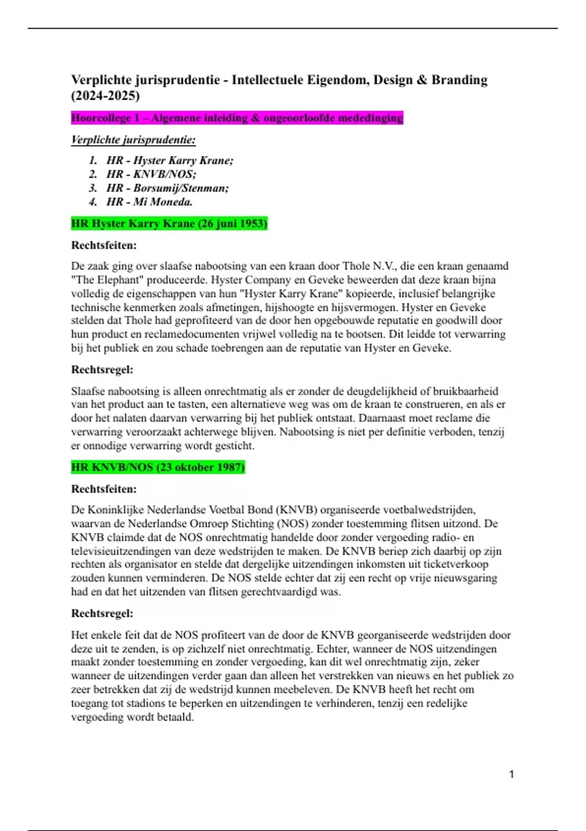 Dit document bevat alle verplichte arresten voor het vak Intellectuele eigendom, design en branding van het studiejaar . Alle arresten zijn beschreven middels de data, rechtsfeiten en rechtsregels. Alle jurisprudentie van hoorcolleges 1 t/m 8 zijn opgenomen. Succes met voorbereiding voor het tentamen :)!