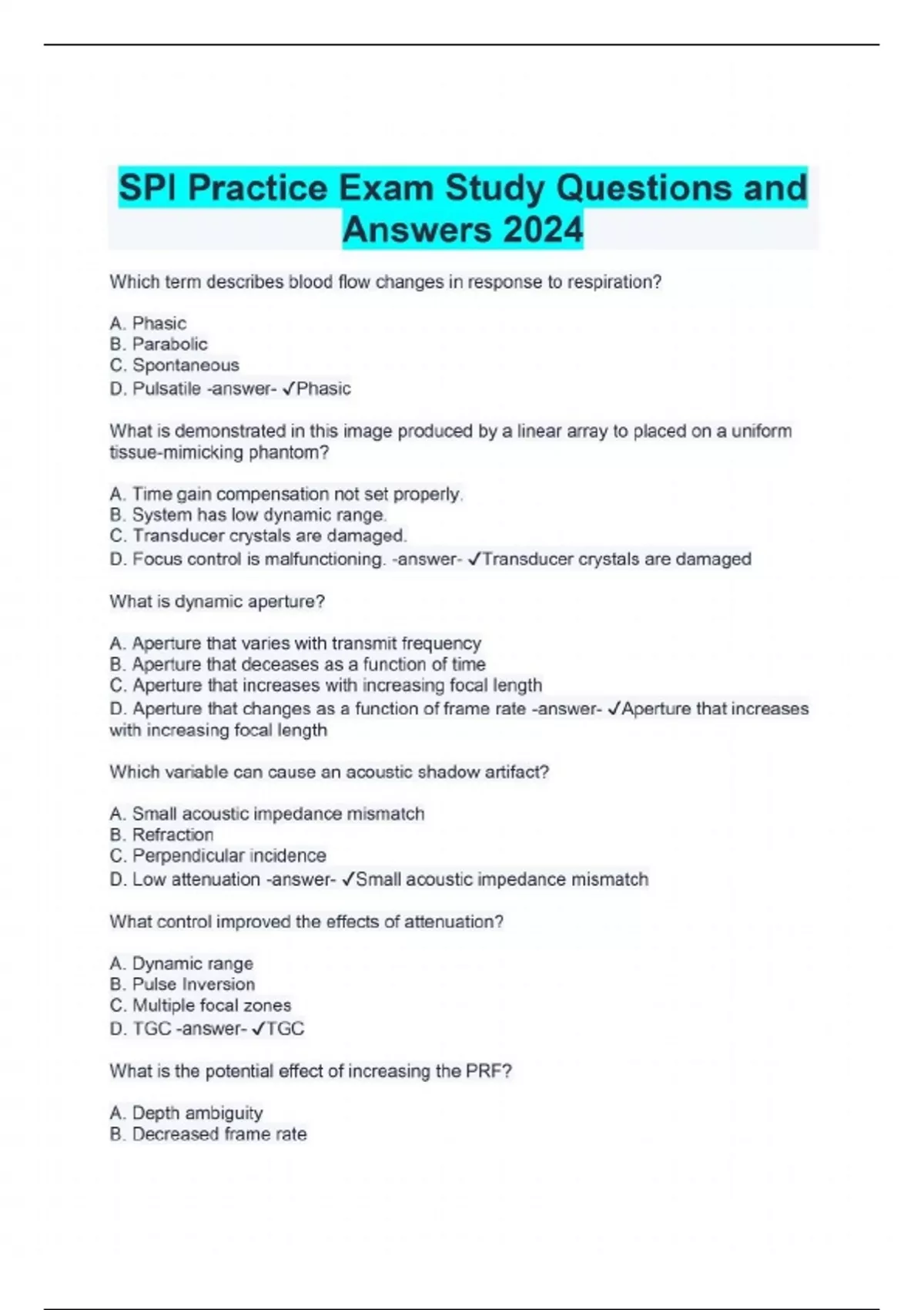 Which term describes blood flow changes in response to respiration? A. Phasic B. Parabolic C. Spontaneous D. Pulsatile -answer- Phasic What is demonstrated in this image produced by a linear array to placed on a uniform tissue-mimicking phantom? A. Time gain compensation not set properly. B. System has low dynamic range. C. Transducer crystals are damaged. D. Focus control is malfunctioning. -answer- Transducer crystals are damaged What is dynamic aperture? A. Aperture that varies with transmit frequency B. Aperture that deceases as a function of time C. Aperture that increases with increasing focal length D. Aperture that changes as a function of frame rate -answer- Aperture that increases with increasing focal length Which variable can cause an acoustic shadow artifact? A. Small acoustic impedance mismatch B. Refraction C. Perpendicular incidence D. Low attenuation -answer- Small acoustic impedance mismatch What control improved the effects of attenuation? A. Dynamic range B. Pulse Inversion C. Multiple focal zones D. TGC -answer- TGC What is the potential effect of increasing the PRF? A. Depth ambiguity B. Decreased frame rate C. Poor spatial resolution D. Decreased penetration -answer- Decreased penetration How is lateral resolution determined for a pulse-echo system using a tissue-mimicking test object? A. By observing spaces between reflectors perpendicular to the beam B. By observing spaces between reflectors along the beam path C. By observing position of deepest visible reflector along the beam path D. By observing position of deepest visible reflector perpendicular to the beam path -answer- By observing spaces between reflectors perpendicular to the beam According to ALARA guidelines, which parameter should be minimized? A. Transmit power B. Frequency C. TGC D. Overall gain -answer- Transmit power Which statement is most acurate regarding surface rendering 3D ultrasound imaging? A. Improves accuracy of volume measurement B. Minimizes effect of attenuation artifacts C. Spatial resolution improve when using high resolution mesh D. Feature-based reconstruction store full 3D volume acquired -answer- Minimizes effect of attenuation artifacts Which artifact is indicated by the arrows in this image? A. Shadow produced by the diaphragm B. Acoustic enhancement C. Comet tail D. Mirror image -answer- Comet tail Which imaging modality can provide the most accurate measurement of tumor volume? A. Color Doppler B. B-mode C. A - mode D. M-mode -answer- B-mode