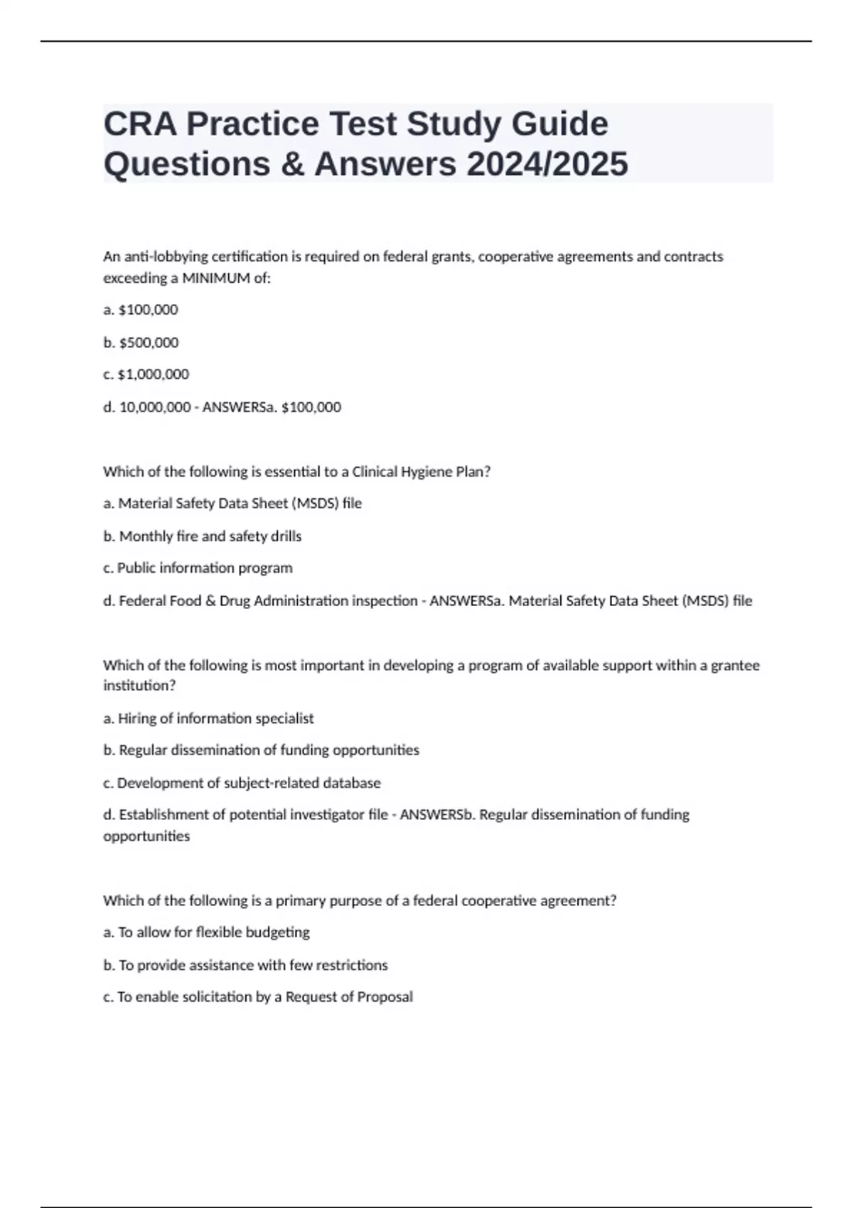 d. Federal Food & Drug Administration inspection - ANSWERSa. Material Safety Data Sheet (MSDS) file