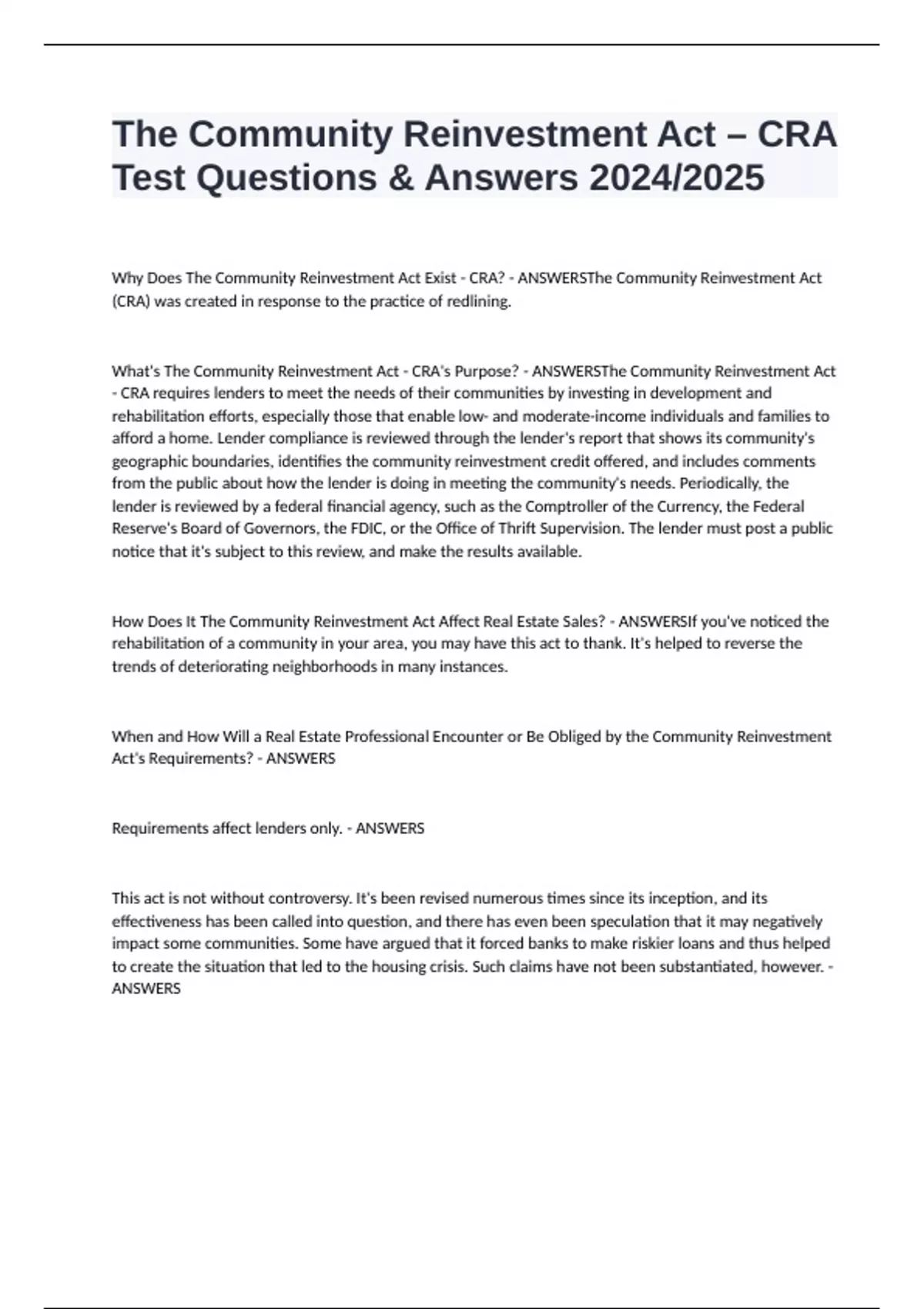 The Community Reinvestment Act – CRA Test Questions & Answers 2024/2025