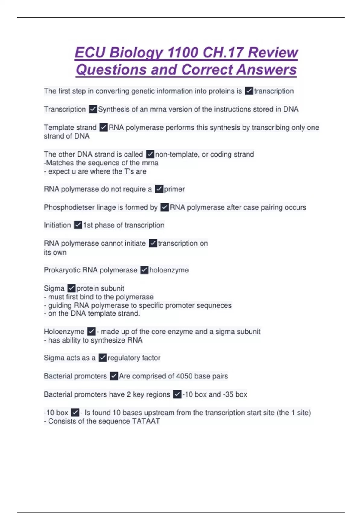 The first step in converting genetic information into proteins is transcription Transcription Synthesis of an mrna version of the instructions stored in DNA Template strand RNA polymerase performs this synthesis by transcribing only one strand of DNA The other DNA strand is called non-template, or coding strand -Matches the sequence of the mrna - expect u are where the T's are RNA polymerase do not require a primer Phosphodietser linage is formed by RNA polymerase after case pairing occurs Initiation 1st phase of transcription RNA polymerase cannot initiate transcription on its own Prokaryotic RNA polymerase holoenzyme Sigma protein subunit - must first bind to the polymerase - guiding RNA polymerase to specific promoter sequneces - on the DNA template strand. Holoenzyme - made up of the core enzyme and a sigma subunit - has ability to synthesize RNA Sigma acts as a regulatory factor Bacterial promoters Are comprised of 4050 base pairs Bacterial promoters have 2 key regions -10 box and -35 box -10 box - Is found 10 bases upstream from the transcription start site (the 1 site) - Consists of the sequence TATAAT