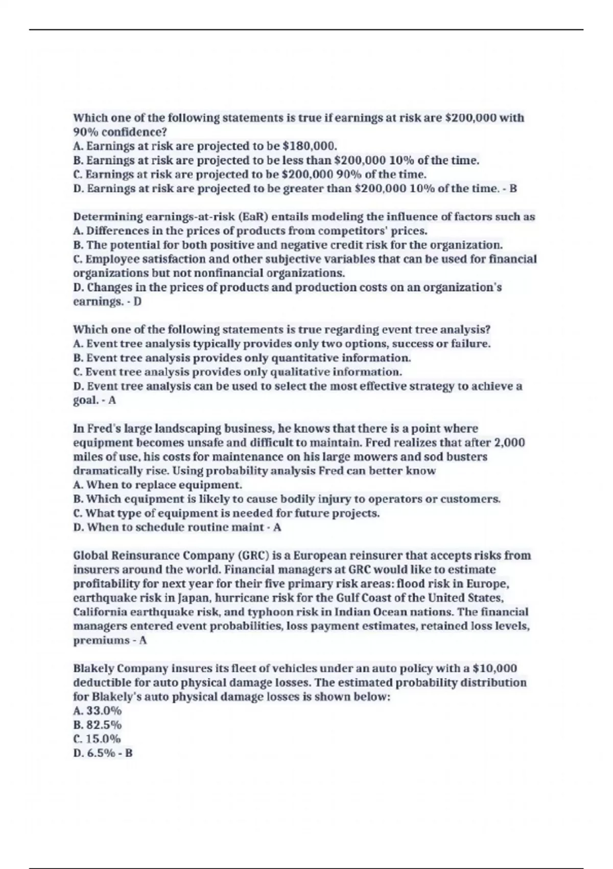 Which one of the following statements is true if earnings at risk are $200,000 with 90% confidence? A. Earnings at risk are projected to be $180,000. B. Earnings at risk are projected to be less than $200,000 10% ofthe time. C. Earnings at risk are projected to be $200,000 90% of the time. D. Earnings at risk are projected to be greater than $200,000 10% ofthe time. - B Determining earnings-at-risk (EaR) entails modeling the influence of factors such as A. Differences in the prices of products from competitors' prices. B. The potential for both positive and negative credit risk for the organization. C. Employee satisfaction and other subjective variables that can be used for financial organizations but not nonfinancial organizations. D. Changes in the prices of products and production costs on an organization's earnings. - D Which one of the following statements is true regarding event tree analysis? A. Event tree analysis typically provides only two options, success or failure. B. Event tree analysis provides only quantitative information. C. Event tree analysis provides only qualitative information. D. Event tree analysis can be used to select the most effective strategy to achieve a goal. - A In Fred 's large landscaping business, he knows that there is a point where equipment becomes unsafe and difficult to maintain. Fred realizes that after 2,000 miles of use, his costs for maintenance on his large mowers and sod busters dramatically rise. Using probability analysis Fred can better know A. When to replace equipment. B. Which equipment is likely to cause bodily injury to operators or customers. C. What type of equipment is needed for future projects. D. When to schedule routine maint - A Global Reinsurance Company (GRC) is a European reinsurer that accepts risks from insurers around the world. Financial managers at GRC would like to estimate profitability for next year for their five primary risk areas: flood risk in Europe, earthquake risk in Japan, hurricane risk for the Gulf Coast of the United States, California earthquake risk, and typhoon risk in Indian Ocean nations. The financial managers entered event probabilities, loss payment estimates, retained loss levels, premiums - A Blakely Company insures its fleet of vehicles under an auto policy with a $10,000 deductible for auto physical damage losses. The estimated probability distribution for Blakely's auto physical damage losses is shown below: A. 33.0% B. 82.5% c. 15.0% D. 6.5% -B Decision tree analysis and event tree analysis are similar in a number of ways, but differ in their A. Process. B. Approach. C. Purpose. D. Appearance. - C Which one of the following statements is true regarding characteristics of normal distributions? A. In theory, the normal distribution assigns some negative probability no greater than zero for every outcome.