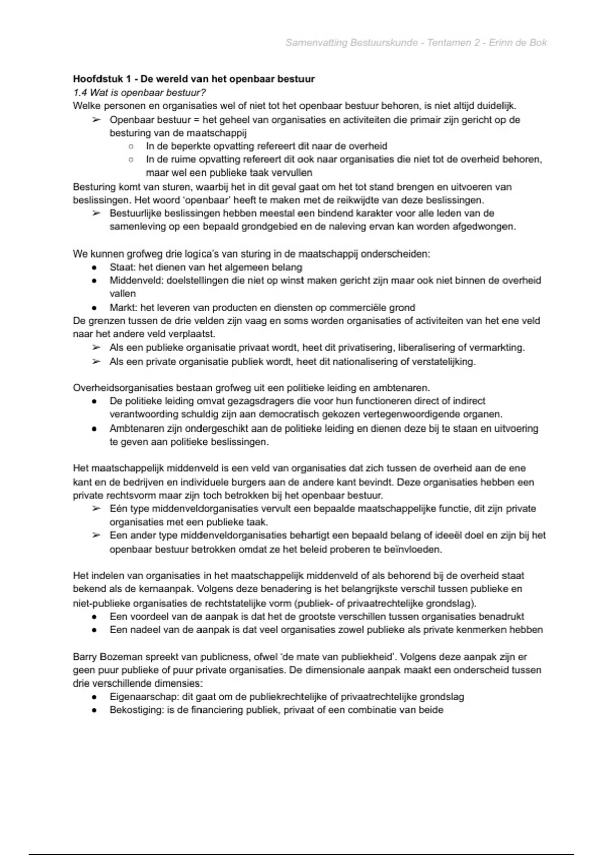 , Samenvatting Bestuurskunde - Tentamen 2 - Erinn de Bok
