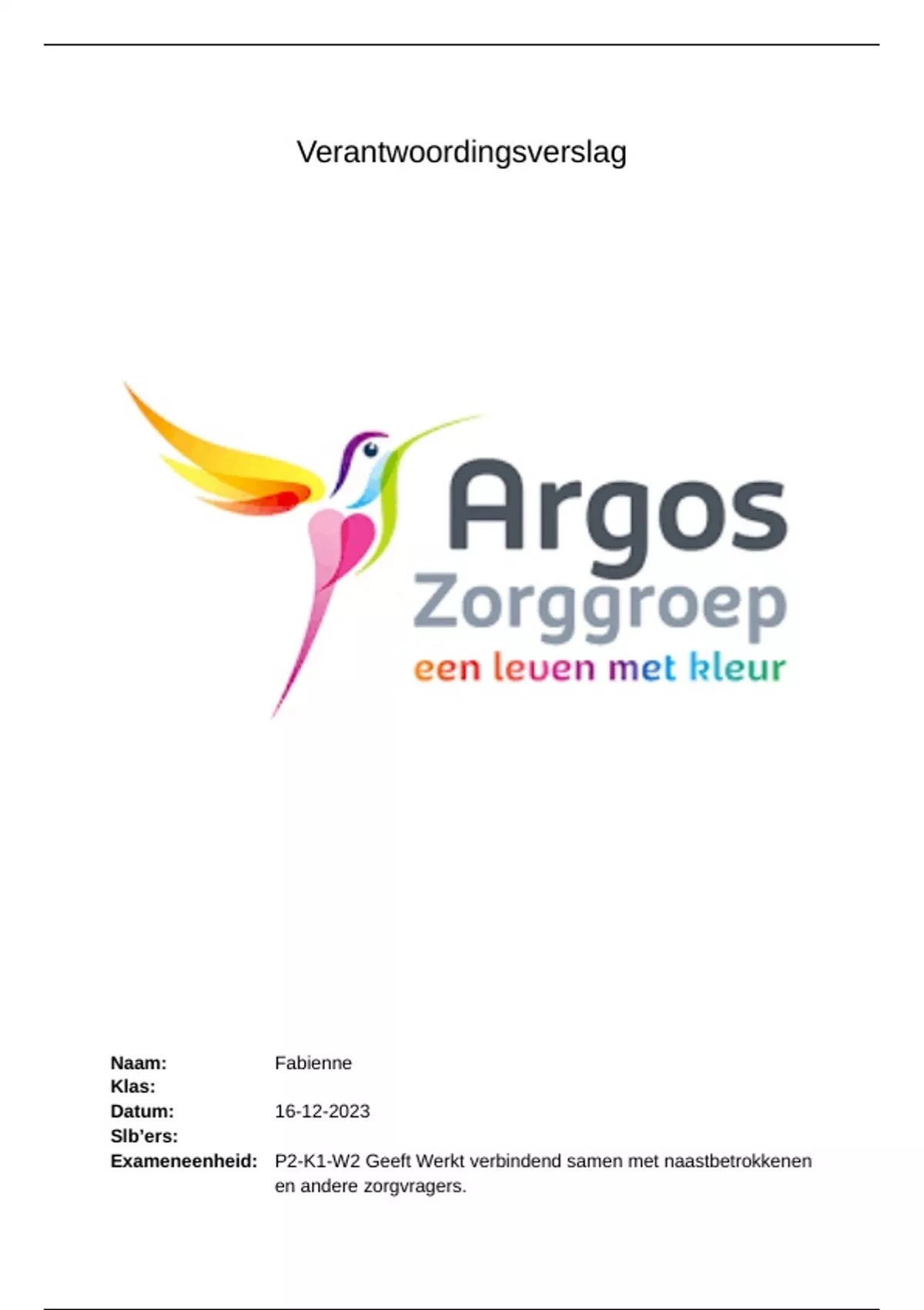 een starrt verslag over het examen Werkt verbindend samen met naastbetrokkenen en andere zorgvragers. Er komen veel belangrijke en interessante onderwerpen voor in dit verslag.