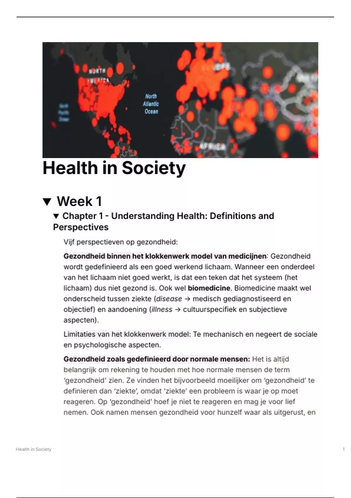 Een samenvatting van alles wat je moet weten voor het tentamen van Health in Society. Het is volledig in het Nederlands en erg begrijpelijk uitgelegd.