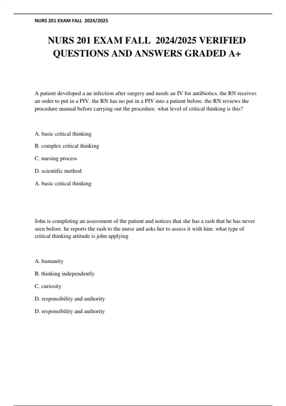 NURS 201 EXAM FALL 2024/2025 VERIFIED QUESTIONS AND ANSWERS GRADED A+