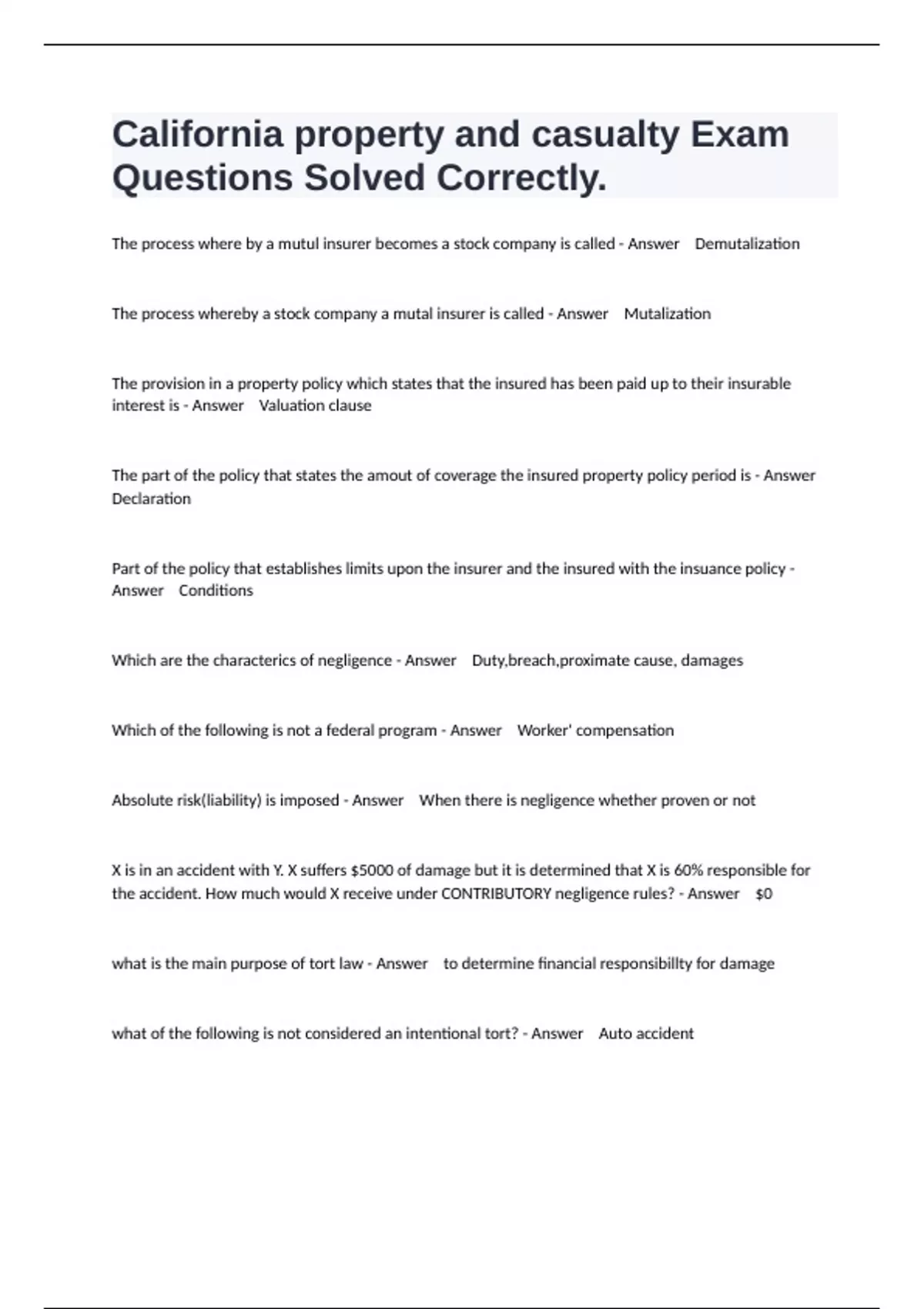 The process where by a mutul insurer becomes a stock company is called - Answer Demutalization The process whereby a stock company a mutal insurer is called - Answer Mutalization The provision in a property policy which states that the insured has been paid up to their insurable interest is - Answer Valuation clause The part of the policy that states the amout of coverage the insured property policy period is - Answer Declaration Part of the policy that establishes limits upon the insurer and the insured with the insuance policy - Answer Conditions Which are the characterics of negligence - Answer Duty,breach,proximate cause, damages Which of the following is not a federal program - Answer Worker' compensation Absolute risk(liability) is imposed - Answer When there is negligence whether proven or not X is in an accident with Y. X suffers $5000 of damage but it is determined that X is 60% responsible for the accident. How much would X receive under CONTRIBUTORY negligence rules? - Answer $0 what is the main purpose of tort law - Answer to determine financial responsibillty for damage what of the following is not considered an intentional tort? - Answer Auto accident