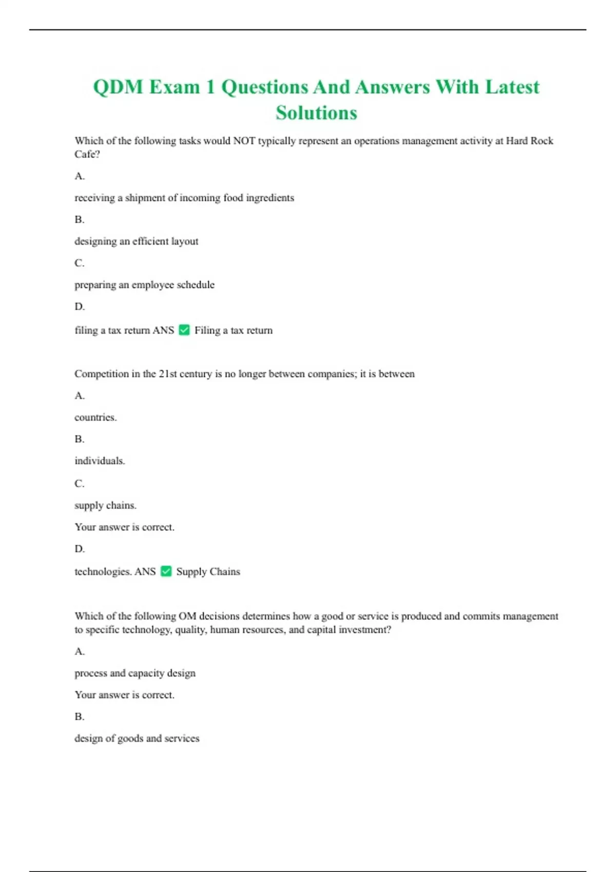 QDM Exam 1 Questions And Answers With Latest Solutions Which of the following tasks would NOT typically represent an operations management activity at Hard Rock Cafe? A. receiving a shipment of incoming food ingredients B. designing an efficient layout C. preparing an employee schedule D. filing a tax return ANS Filing a tax return Competition in the 21st century is no longer between companies; it is between A. countries. B. individuals. C. supply chains. Your answer is correct. D. technologies. ANS Supply Chains Which of the following OM decisions determines how a good or service is produced and commits management to specific technology, quality, human resources, and capital investment?