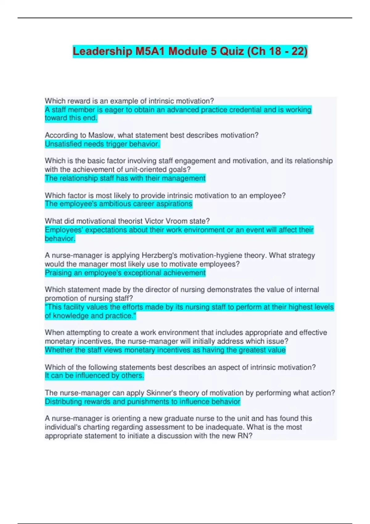 Leadership M5A1 Module 5 Quiz (Ch 18 - 22) | Questions and Answers Which reward is an example of intrinsic motivation? A staff member is eager to obtain an advanced practice credential and is working toward this end. According to Maslow, what statement best describes motivation? Unsatisfied needs trigger behavior. Which is the basic factor involving staff engagement and motivation, and its relationship with the achievement of unit-oriented goals? The relationship staff has with their management Which factor is most likely to provide intrinsic motivation to an employee? The employee's ambitious career aspirations What did motivational theorist Victor Vroom state? Employees' expectations about their work environment or an event will affect their behavior. A nurse-manager is applying Herzberg's motivation-hygiene theory. What strategy would the manager most likely use to motivate employees? Praising an employee's exceptional achievement Which statement made by the director of nursing demonstrates the value of internal promotion of nursing staff? "This facility values the efforts made by its nursing staff to perform at their highest levels of knowledge and practice." When attempting to create a work environment that includes appropriate and effective monetary incentives, the nurse-manager will initially address which issue? Whether the staff views monetary incentives as having the greatest value Which of the following statements best describes an aspect of intrinsic motivation? It can be influenced by others. The nurse-manager can apply Skinner's theory of motivation by performing what action? Distributing rewards and punishments to influence behavior A nurse-manager is orienting a new graduate nurse to the unit and has found this individual's charting regarding assessment to be inadequate. What is the most appropriate statement to initiate a discussion with the new RN? "I'm concerned that your assessment charting seems to be unclear. Can I help you with this?" An RN is a team leader for a small module of clients. While listening to a recorded report on a client, one of the team members remarks, "My mother lives near him, and she says his home life is in chaos." How should the RN best respond? Ask the team member how this information relates to the client's care The nurse is caring for a postoperative client whose pain is not being relieved by the current analgesia regimen. When using the SBAR model for communicating with the client's health-care provider, how should the nurse best address the "A" component of the model? "The client's pain control might be inadequate because she's been rating it at 9 out of 10 for the past hour." A nurse sits at the foot of a patient's bed during an admission interview. This positioning supports the proxemics concept of which psychological comfort zone? Social exchange A nurse-manager is having a difficult conversation with a subordinate whose performance has long been inadequate. The emotional component of the manager's message will be most clearly conveyed by: facial expressions, body movements, and gestures. The nurse is caring for a client with a diagnosis of chronic obstructive pulmonary disease and who is experiencing a new onset of dyspnea. When contacting the client's care provider, the nurse should state the client's admitting diagnosis in what stage of the SBAR tool? B The nurse-manager has consulted the hospital information system to address a clinical issue. What characteristic is the hospital information system most likely to have? It is probably not freely available from the Internet. The nurse-manager has been approached by an angry employee whose vacation request was denied. What should the manager do when communicating with this employee? Select all that apply. Allow the employee sufficient opportunity to express what she wants from the manager. State, "I understand that you are angry that your vacation request wasn't approved." What is the best example of downward communication by a nurse-manager? The manager reviews the results of a nurse's performance appraisal with the nurse. The nurse-manager is using the GRRRR model of listening when interacting with a colleague who exhibits challenging behaviors. What is the final action that the manager should implement when using this model? Thank the colleague for the collaborative conversation A health-care organization has laid off several RNs and hired numerous NAPs in their place. What effect is this change most likely to have on the remaining RNs? The RNs' level of liability will increase. Periodically during the day, the RN checks with the team members to determine whether they are having difficulty completing their assigned tasks. This describes which manager role? Effective delegation Which task would the director of a home health agency not delegate another staff RN? Meeting with the agency's administration regarding budget cuts A nurse-manager delegates many tasks in the course of a day. Which practice should the manager reconsider or discontinue? The manager provides employees with exact instructions for each step of completing the task. An RN needs to confirm the specific delegation parameters for RNs. The RN should refer to guidelines from what organization? The state board of nursing An RN is leading a care team on a busy hospital unit. What tasks is the RN justified in delegating to NAP? Select all that apply. Transporting a client to a diagnostic test Feeding a client who has unilateral weakness Repositioning an immobile client every 2 hours Weighing a client who has chronic heart failure The nurse-manager has asked an NAP for an update on delegated tasks and the NAP has said, "I'm swamped right now." What is the manager's best response? "I can give you a few solutions to help manage this heavy workload." What principle should guide the nurse's delegation of tasks to unlicensed nursing assistive personnel (NAP)? No federal or community standards have been established for training th