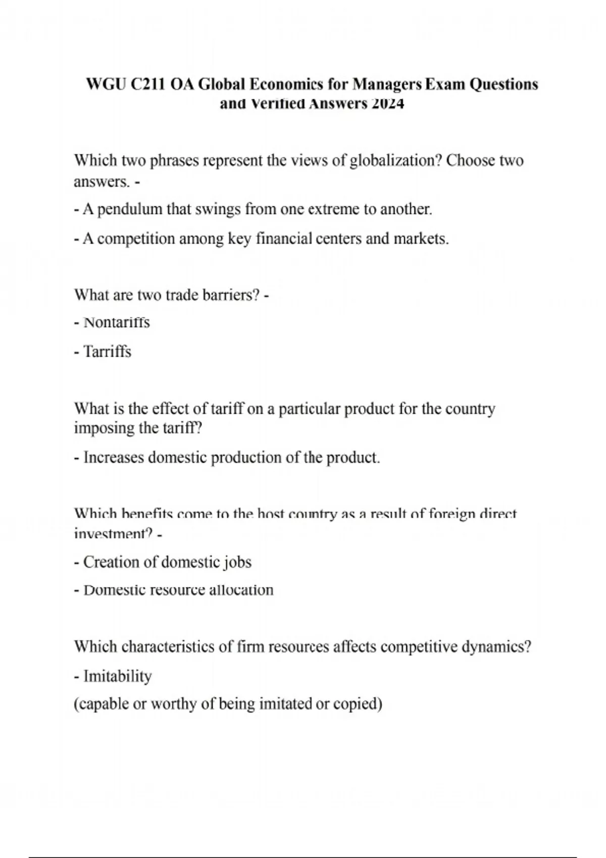 WGU C211 OA Global Economics for Managers Exam Questions and Verified Answers 2024