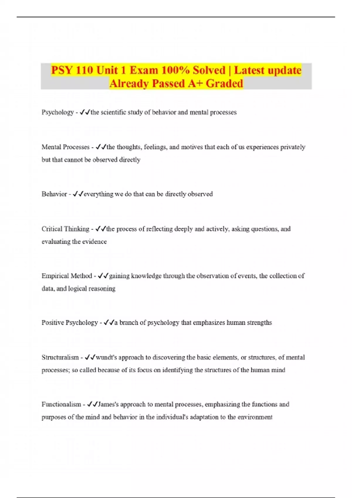 PSY 110 Unit 1 Exam 100% Solved | Latest update Already Passed A+ Graded