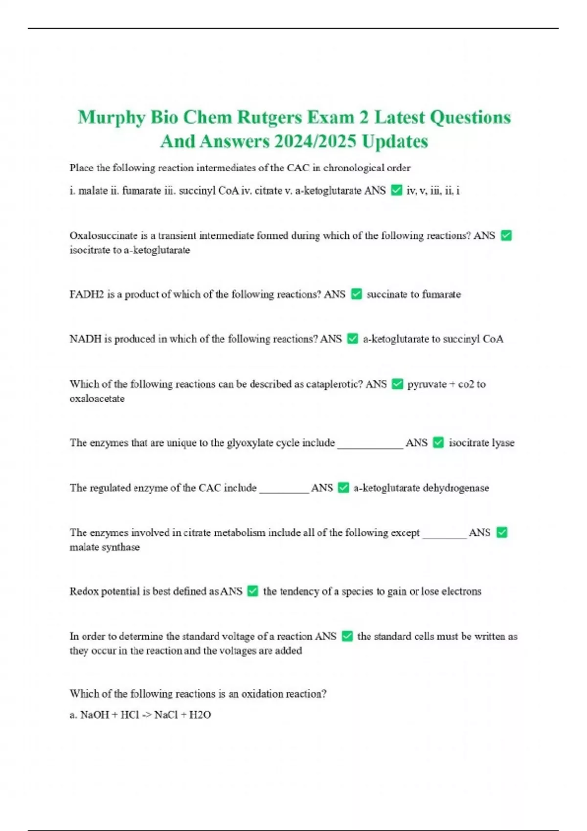 Murphy Bio Chem Rutgers Exam 2 Latest Questions And Answers 2024/2025 Updates Place the following reaction intermediates of the CAC in chronological order i. malate ii. fumarate iii. succinyl CoA iv. citrate v. a-ketoglutarate ANS iv, v, iii, ii, i Oxalosuccinate is a transient intermediate formed during which of the following reactions? ANS isocitrate to a-ketoglutarate FADH2 is a product of which of the following reactions? ANS succinate to fumarate NADH is produced in which of the following reactions? ANS a-ketoglutarate to succinyl CoA Which of the following reactions can be described as cataplerotic? ANS pyruvate + co2 to oxaloacetate
