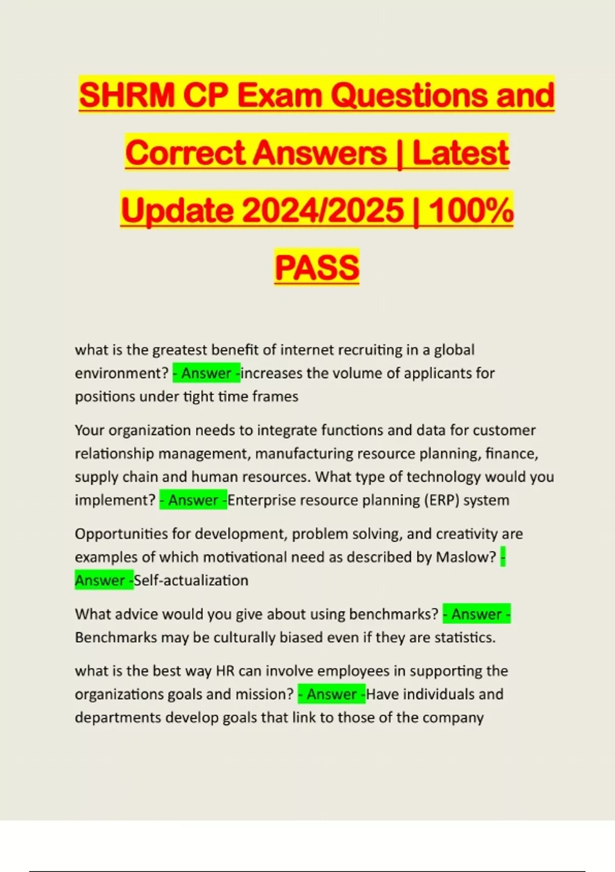 SHRM CP Exam Questions and Correct Answers | Latest Update 2024/2025 | 100% PASS what is the greatest benefit of internet recruiting in a global environment? - Answer -increases the volume of applicants for positions under tight time frames Your organization needs to integrate functions and data for customer relationship management, manufacturing resource planning, finance, supply chain and human resources. What type of technology would you implement? - Answer -Enterprise resource planning (ERP) system Opportunities for development, problem solving, and creativity are examples of which motivational need as described by Maslow? - Answer -Self-actualization What advice would you give about using benchmarks? - Answer - Benchmarks may be culturally biased even if they are statistics. what is the best way HR can involve employees in supporting the organizations goals and mission? - Answer -Have individuals and departments develop goals that link to those of the companyWhat is the first thing an employer should do when conduc