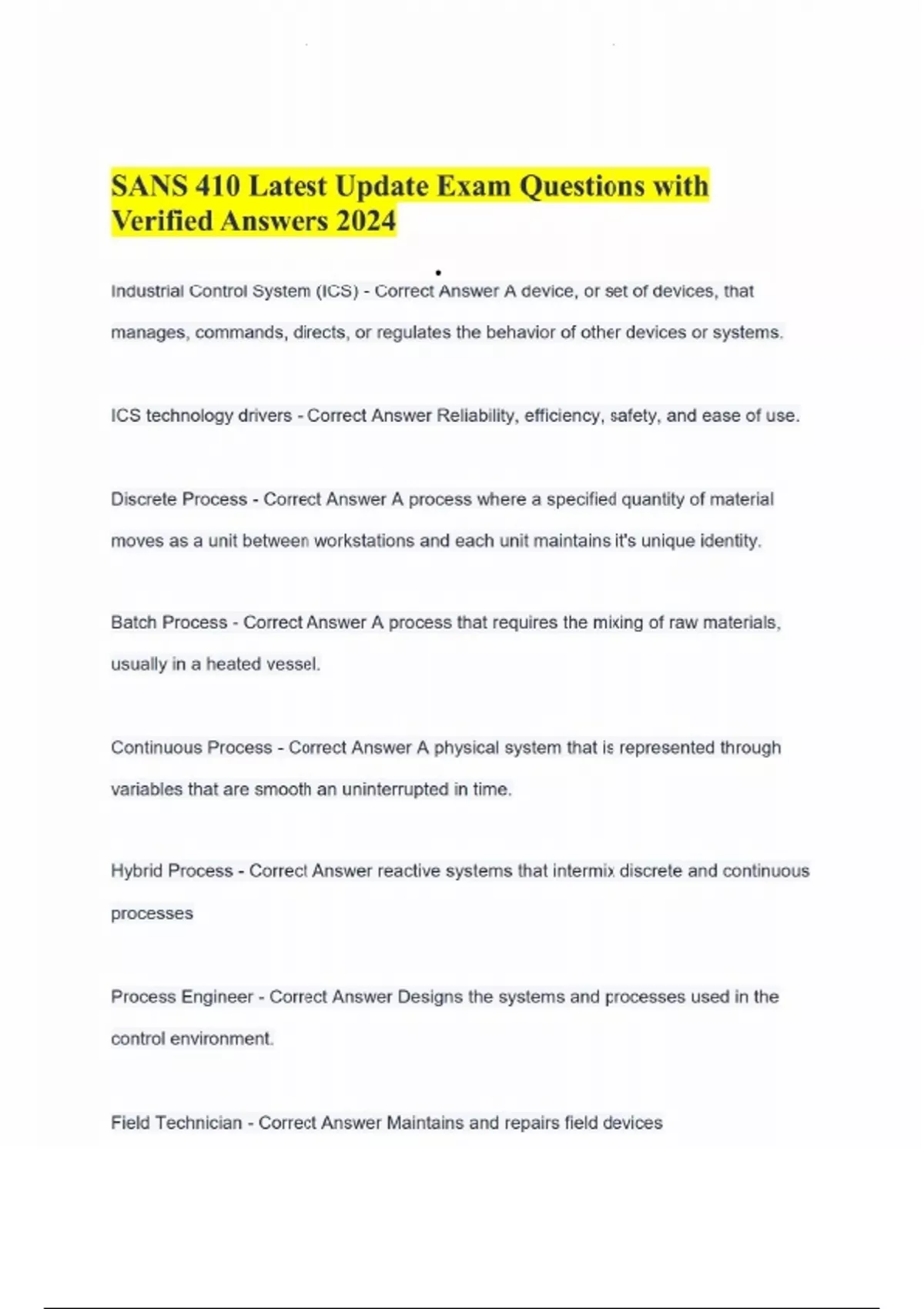 SANS 410 Latest Update Exam Questions with Verified Answers 2024 • Industrial Control System (ICS) - Correct Answer A device, or set of devices, that manages, commands, directs, or regulates the behavior of other devices or systems. ICS technology drivers - Correct Answer Reliability, efficiency, safety, and ease of use. Discrete Process - Correct Answer A process where a specified quantity of material moves as a unit between workstations and each unit maintains it's unique identity. Batch Process - Correct Answer A process that requires the mixing of raw materials, usually in a heated vessel. Continuous Process - Correct Answer A physical system that is represented through variables that are smooth an uninterrupted in time. Hybrid Process - Correct Answer reactive systems that intermix discrete and continuous processes Process Engineer - Correct Answer Designs the systems and processes used in the control environment. Field Technician - Correct Answer Maintains and repairs field devices Programmer - Correct Answer Implements the individual steps of the process code and deploys the code to the controllers. Operator - Correct Answer Works in the operations center remotely managing and controlling the process