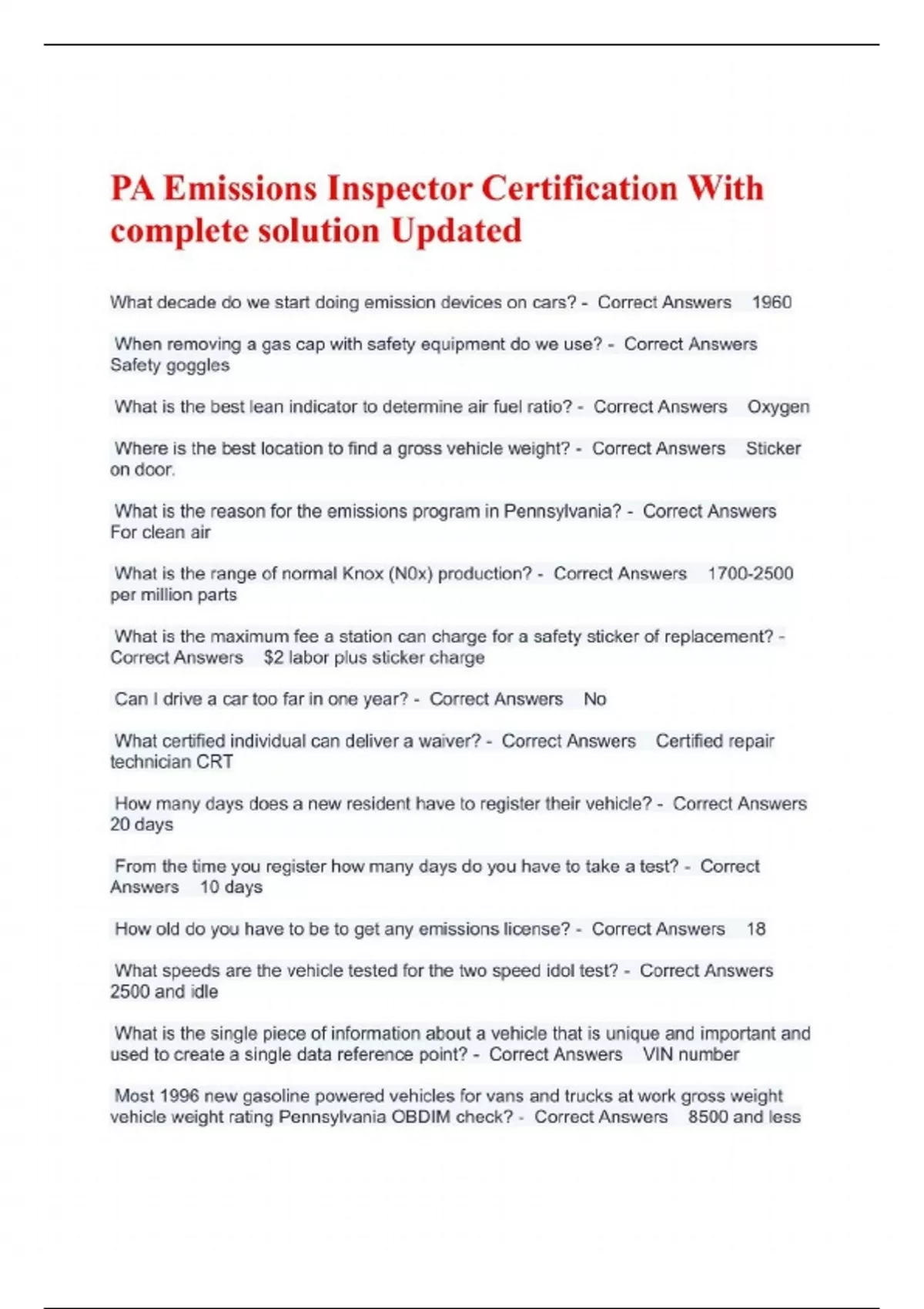 PA Emissions Inspector Certification With complete solution Updated