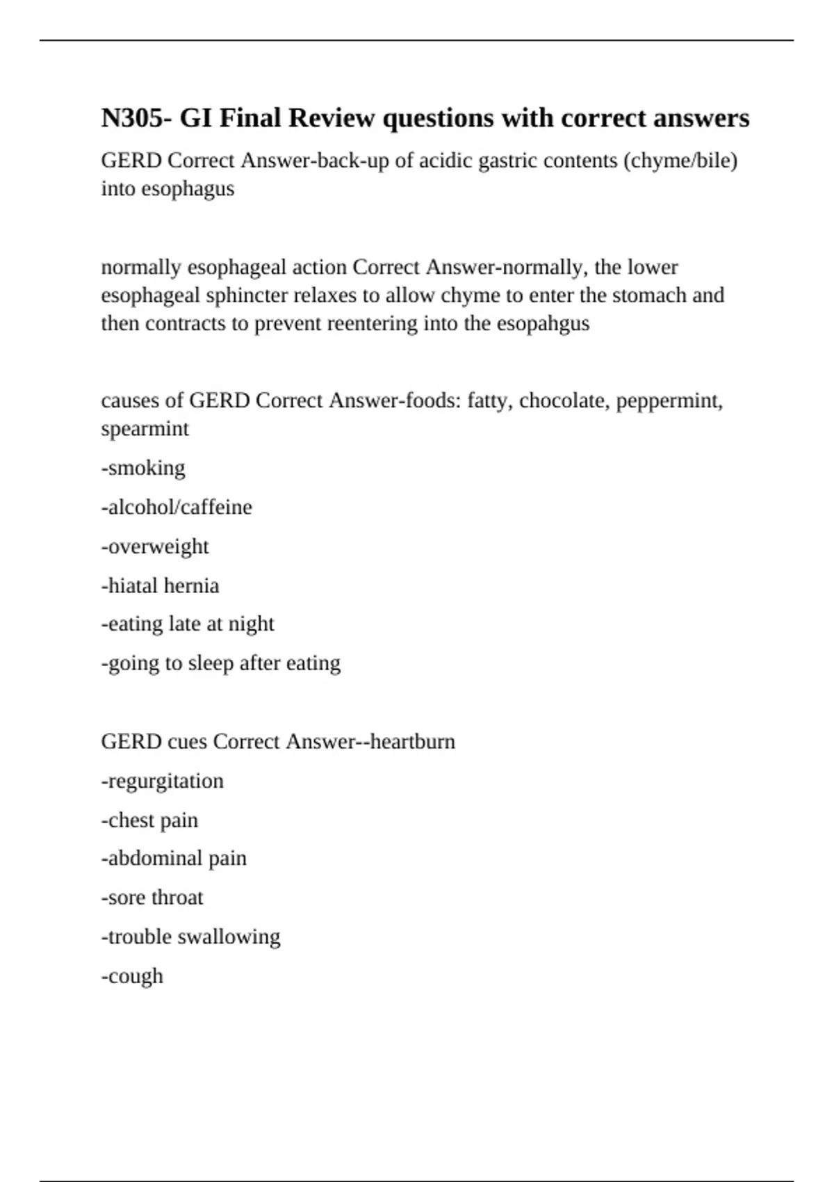 causes of GERD Correct Answer-foods: fatty, chocolate, peppermint,
