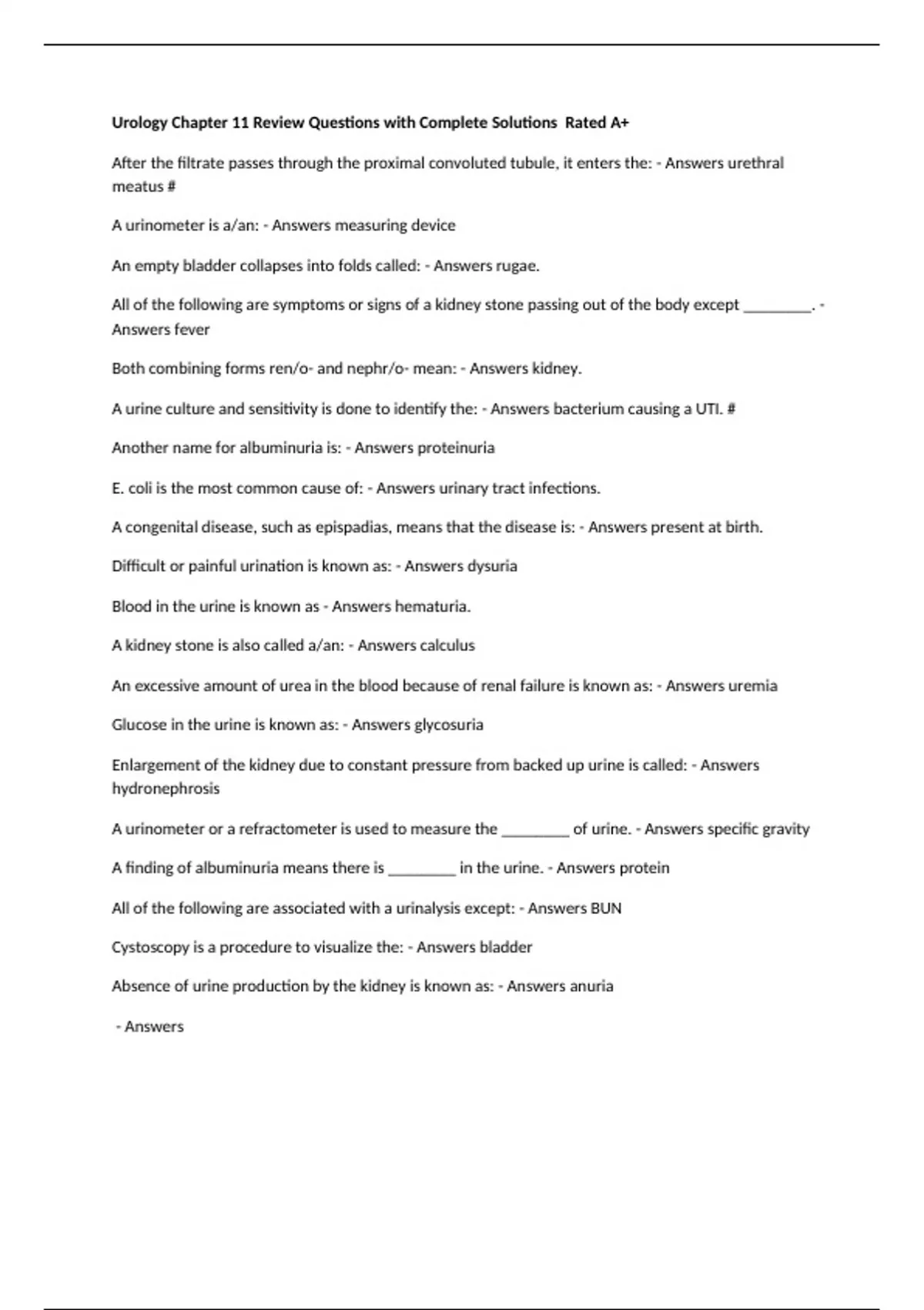 Urology Chapter 11 Review Questions with Complete Solutions Rated A+ After the filtrate passes through the proximal convoluted tubule, it enters the: - Answers urethral meatus # A urinometer is a/an: - Answers measuring device An empty bladder collapses into folds called: - Answers rugae. All of the following are symptoms or signs of a kidney stone passing out of the body except ________. - Answers fever Both combining forms ren/o- and nephr/o- mean: - Answers kidney. A urine culture and sensitivity is done to identify the: - Answers bacterium causing a UTI. # Another name for albuminuria is: - Answers proteinuria E. coli is the most common cause of: - Answers urinary tract infections. A congenital disease, such as epispadias, means that the disease is: - Answers present at birth. Difficult or painful urination is known as: - Answers dysuria Blood in the urine is known as - Answers hematuria. A kidney stone is also called a/an: - Answers calculus An excessive amount of urea in the blood because of renal failure is known as: - Answers uremia Glucose in the urine is known as: - Answers glycosuria