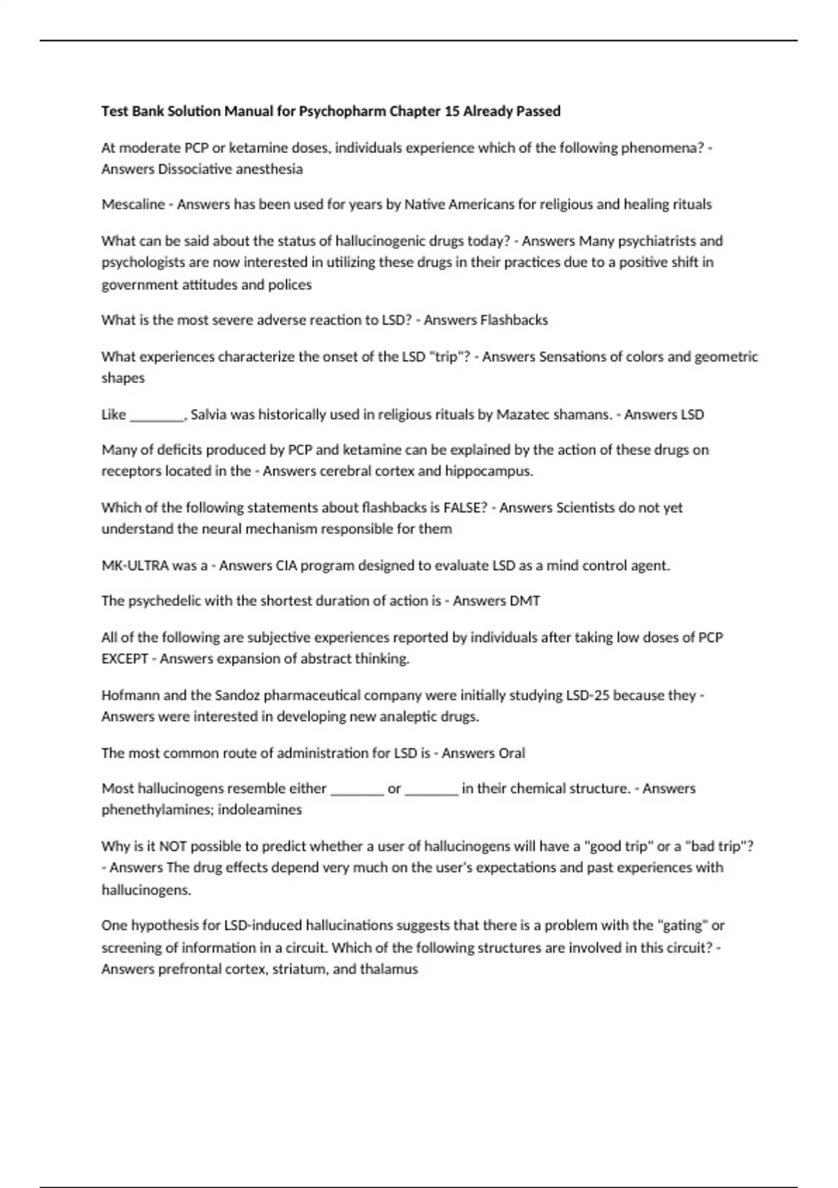 Test Bank Solution Manual for Psychopharm Chapter 15 Already Passed At moderate PCP or ketamine doses, individuals experience which of the following phenomena? - Answers Dissociative anesthesia Mescaline - Answers has been used for years by Native Americans for religious and healing rituals What can be said about the status of hallucinogenic drugs today? - Answers Many psychiatrists and psychologists are now interested in utilizing these drugs in their practices due to a positive shift in government attitudes and polices What is the most severe adverse reaction to LSD? - Answers Flashbacks What experiences characterize the onset of the LSD "trip"? - Answers Sensations of colors and geometric shapes Like _______, Salvia was historically used in religious rituals by Mazatec shamans. - Answers LSD Many of deficits produced by PCP and ketamine can be explained by the action of these drugs on receptors located in the - Answers cerebral cortex and hippocampus. Which of the following statements about flashbacks is FALSE? - Answers Scientists do not yet understand the neural mechanism responsible for them MK-ULTRA was a - Answers CIA program designed to evaluate LSD as a mind control agent. The psychedelic with the shortest duration of action is - Answers DMT All of the following are subjective experiences reported by individuals after taking low doses of PCP EXCEPT - Answers expansion of abstract thinking. Hofmann and the Sandoz pharmaceutical company were initially studying LSD-25 because they - Answers were interested in developing new analeptic drugs. The most common route of administration for LSD is - Answers Oral Most hallucinogens resemble either _______ or _______ in their chemical structure. - Answers phenethylamines; indoleamines Why is it NOT possible to predict whether a user of hallucinogens will have a "good trip" or a "bad trip"? - Answers The drug effects depend very much on the user's expectations and past experiences with hallucinogens. One hypothesis for LSD-induced hallucinations suggests that there is a problem with the "gating" or screening of information in a circuit. Which of the following structures are involved in this circuit? - Answers prefrontal cortex, striatum, and thalamus Researchers have considered LSD as a possible tool for all of the following research approaches or treatment programs EXCEPT - Answers treatment of anxiety and mood disorders The Harvard Psychedelic Drug Research Program - Answers eventually closed when Leary and Alpert were fired from their jobs as heads of the program, marking an end to the psychedelic movement. Which of the following events does NOT occur during the plateau or peak of the LSD "trip"? - Answers Time sense distortion Which of the following regarding the drug PCP or phencyclidine is FALSE? - Answers It causes a trance-like state in which the subject is highly responsive to pain. The least potent psychedelic is - Answers mescaline. At moderate PCP or ketamine doses, individuals experience which of the following phenomena? - Answers Dissociative anesthesia Which of the following about "date rape" drugs is FALSE? - Answers The government recently passed legislation to increase the penalties for sale or possession of these drugs. Which of the following statements concerning the side effects of anabolic steroids is true? - Answers Common effects of steroid use include acne and cardiovascular problems. All of the following symptoms have been observed during the abuse of inhalants EXCEPT - Answers mania. Which of the following is NOT a characteristic of abused inhalant drugs? - Answers While humans find inhalant drugs to be reinforcing, animals do not. Regarding patterns and demographics of inhalant use, - Answers surveys indicate that inhalants are the most popular abused substances of 12-year- olds It is thought that GHB may be co-released with GABA upon neuronal firing because - Answers it can be taken up into GABAergic vesicles. According to the history of anabolic steroid use, - Answers Oral-Turabinol use by female athletes in the GDR was linked to many achievements and Olympic medals. Specific effects of anabolic steroids on males and females include all of the following EXCEPT - Answers shrinking of the prostate in males. In addition to their desired effects on muscle, anabolic steroids negatively affect several physiological systems, including the heart, _______ and _______. - Answers the kidneys; the liver Anabolic steroids are structurally related to - Answers testosterone. Heavy users of anabolic steroids may show all of the following psychological or behavioral symptoms EXCEPT - Answers impaired cognitive function. GHB has all of the following effects in animals EXCEPT - Answers increased anxiety in the elevated plus maze. With regard to types of inhalants, - Answers volatile solvents include adhesives, ink, and correction fluid. Dependence on anabolic steroids is - Answers supported by many studies in the literature suggesting users meet most of the DSM criteria for substance abuse and withdrawal. The immediate effects of volatile and gaseous inhalants are similar to those seen following use of - Answers alcohol. All of the following are health risks of inhalant use EXCEPT - Answers coronary heart disease. Studies have shown that radiolabeled toluene injected into the brain disproportionately labels the - Answers striatum and cerebellum. One legitimate use for GHB in the United States is - Answers to treat narcolepsy. Low doses of GHB produce all of the following EXCEPT - Answers perceptual disturbances. Inhalants - Answers have been linked to long-term damage to the brain and other organs. Which of the following is NOT one of the symptoms of lead poisoning described by Hippocrates? - Answers Melancholia Which of the following about bisphenol A (BPA) is FALSE? - Answers Metabolism occurs in the heart. Early childhood lead exposure associated with levels above 10 μg/dl is associated with all of the following EXCEPT for - 