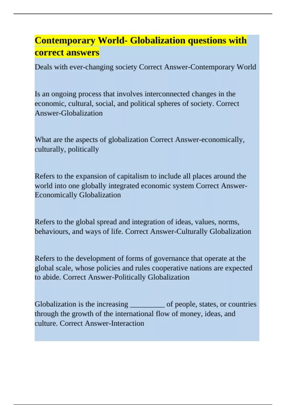 behaviours, and ways of life. Correct Answer-Culturally Globalization