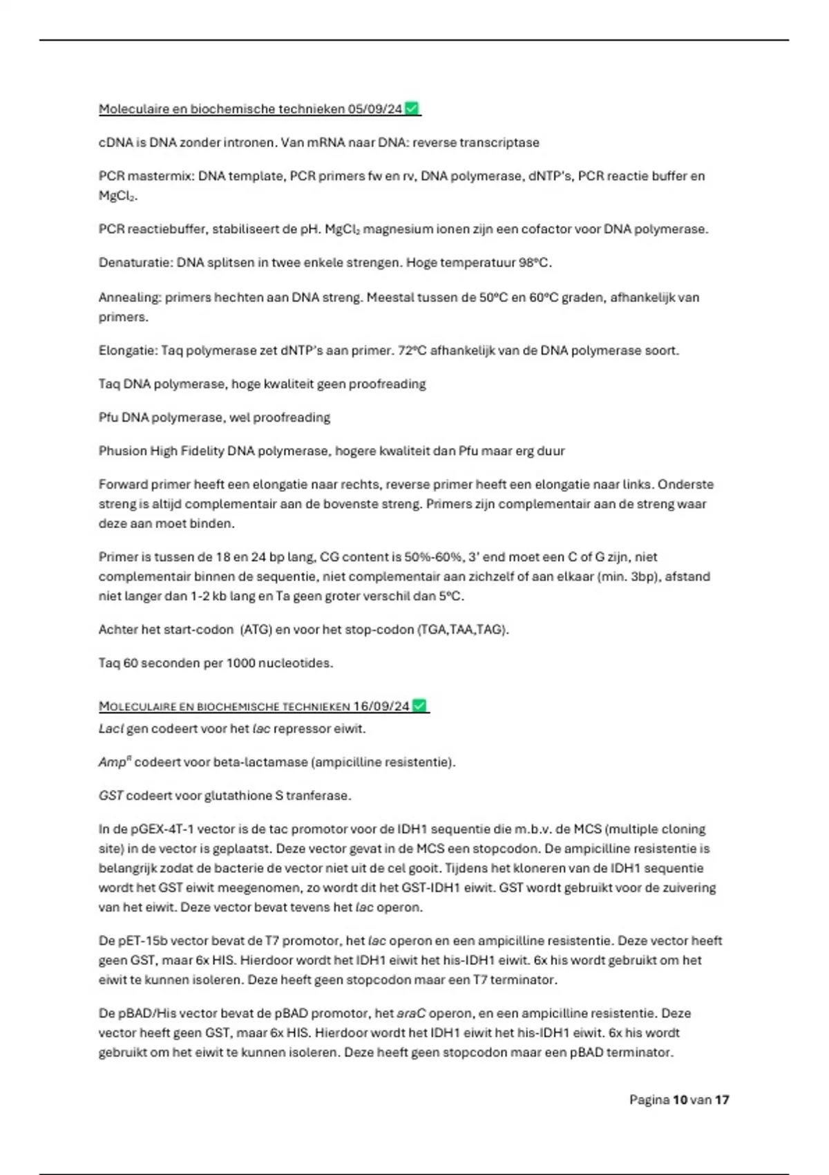 Samenvatting met aantekeningen uit de les. Vectoren zijn beschreven. Componenten PCR reactie zijn beschreven. Sequencing is beschreven. Volledige samenvatting nodige informatie start praktijk.
